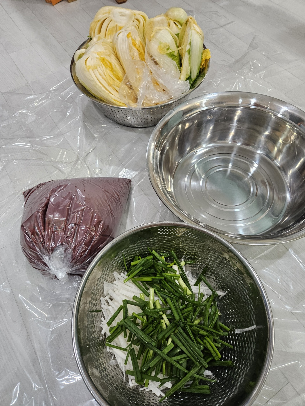 '오마담'이란 인스타를 통해 절인 배추 10kg과 양념장을 구입했다. 양푼과 채반을 사고 바닥에 깔 비닐도 샀다. 무를 채 썰어 넣으면 맛있다기에 무도 사고 쪽파도 샀다. 준비완료! 그런데 필요치 않은(?) 것이 내 앞을 가로막는다. 앞치마를 두르고 비닐장갑을 낀 9살 아들이다.