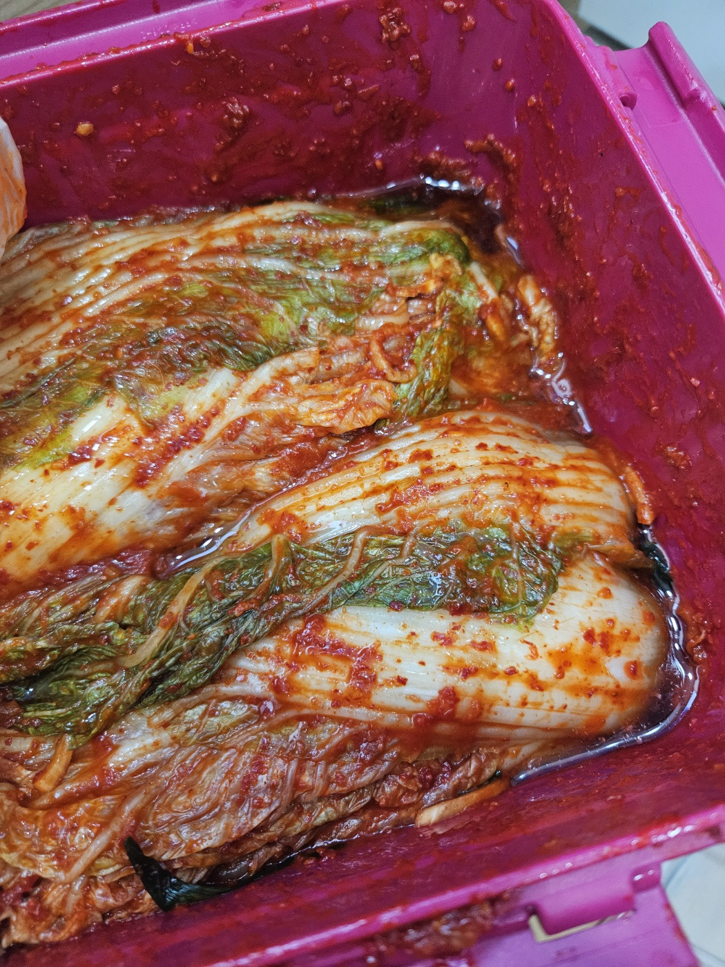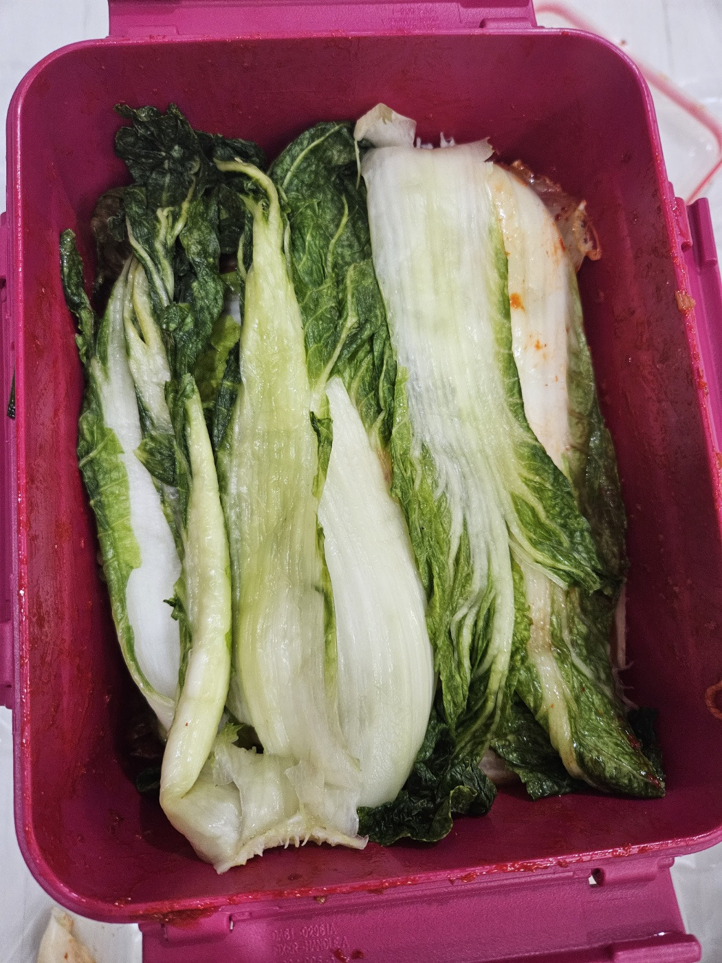 반 갈라진 8개의 배추 덩어리들이 양푼에 담겼다. 지난번엔 양념을 너무 처발라 짜게 된 것 같으니 올해는 적당히 하기로 한다. 아들 이렇게 얇게 발라, 한 두장은 안 바르고 넘어가도 돼. 그렇지 잘한다 잘한다 잘한다. 다음부터는 어린이용 비닐장갑도 준비해 놓으라는 아드님의 잔소리를 들으며 4 포기를 완성했다. 한데 양념이 이렇게 많이 남는 거 맞음? 반이나 남았다.