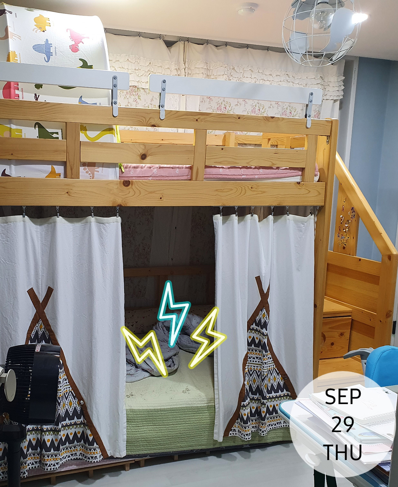 거기다 캠핑 스타일로 커튼까지 쳐주고 동굴인지 지붕인지도 씌어주고 얼마나 (늬 아빠가) 정성을 쏟았는데.