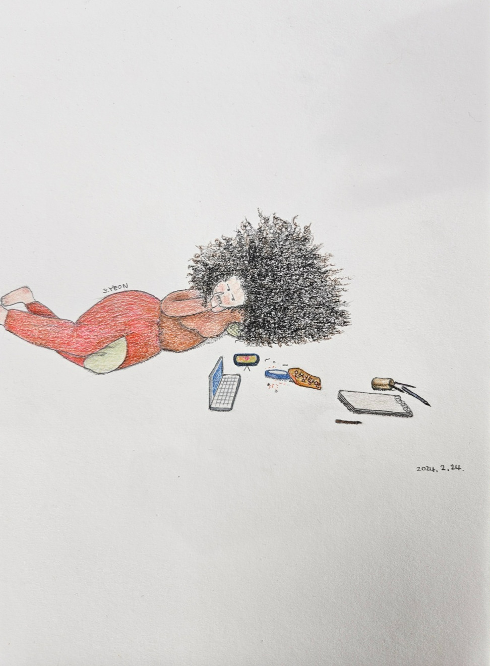 만반의 준비가 끝났다. 특별히 이번엔 손흥민과 이강인의 경기가 연이어 있어 세상 가장 어려운 결정을 해야 한다. 새벽 내 두 경기를 다 봤다간 다음날 기절각이니 엄마로서 최소한의 도리라도 하려면 한 경기만 선택해야 한다. 오 어찌 나에게 이런 시련이! 깊은 성찰 후 마음이 이끄는 한 경기를 선택한다. 생라면을 야무지게완봉하고 육덕진 몸으로 뱃살을 받쳐가며 코를 후비다 문득, '바로 지금이야, 지금의 나를 그리는 거야' 드디어 건드려진 예술혼에 드디어 쓰임 받는 스케치북.
