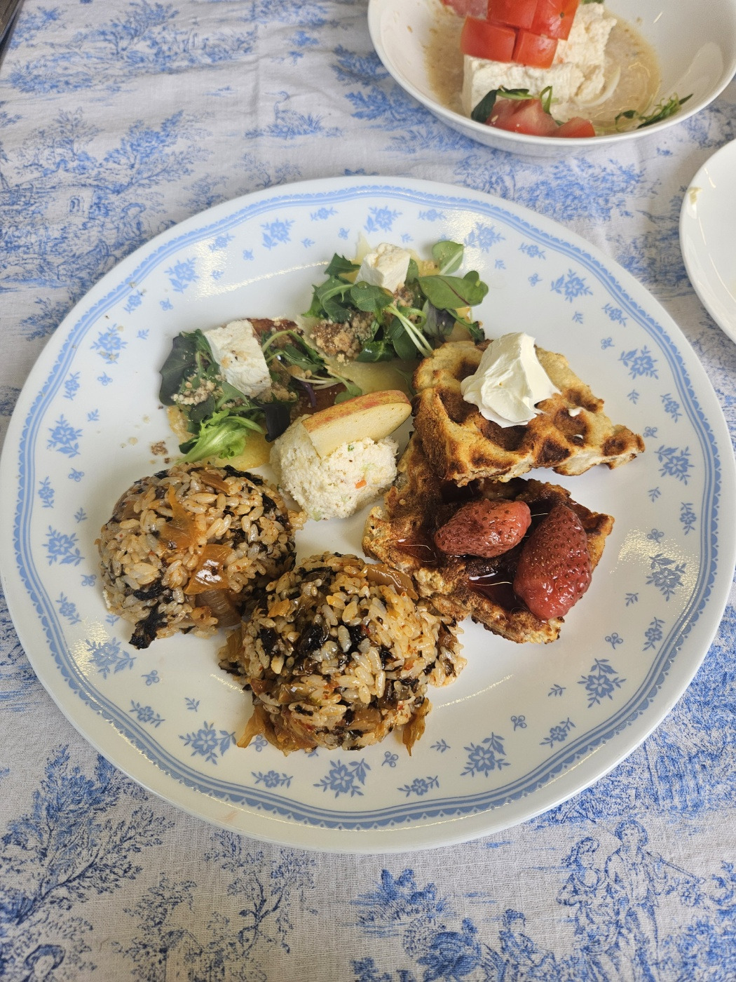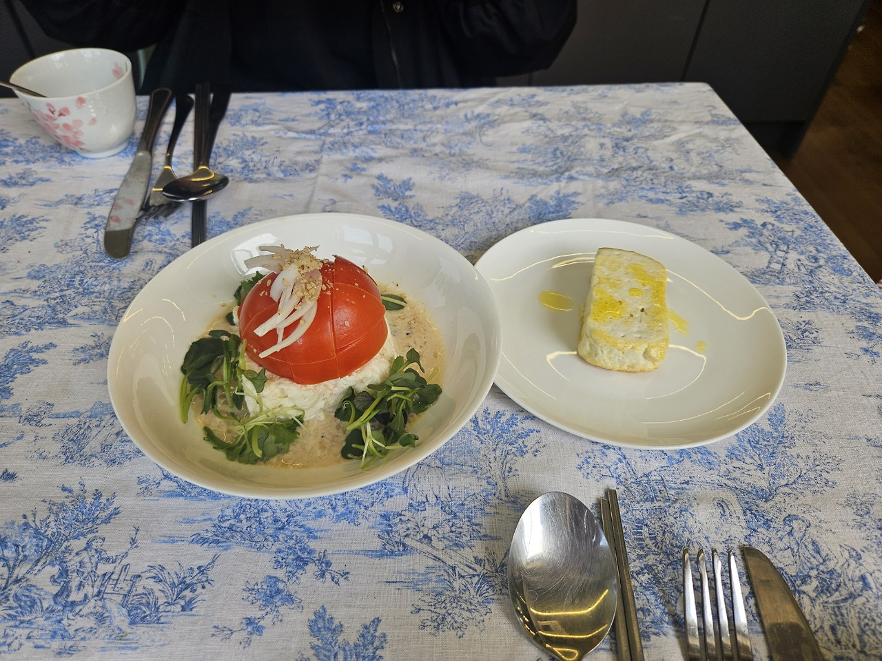 하나같이 건강하고 고소하고 정성이 들어간 맛이었다. 두부브런치에는 두부로 만든 와플도 있었다. 과연 맛이 있을까 싶었는데 호오 괜찮았다. 게다가 두부로 만든 수제비라니, 나 수제비 좋아하는디. 국물도 진하고 맘에 쏙 들었다. 단 한 가지, (가운데 사진) 접시가 우리 집에 있는 거랑 똑같아서 기분이 그닥... 외식기분 느껴야 하는데 저 접시 땜 넘 우리 집 냄새가.