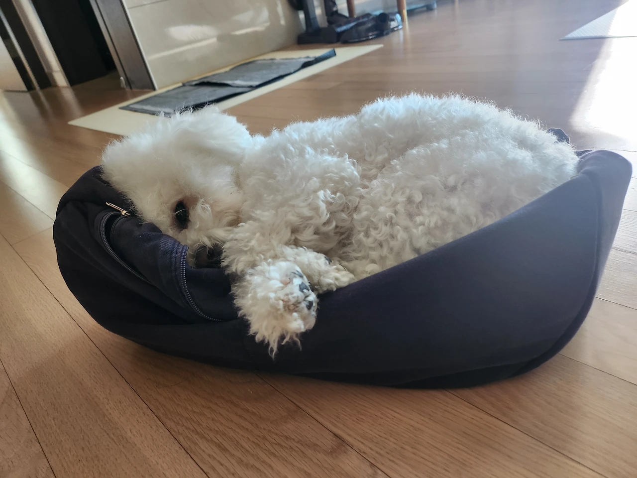 또 집 바닥에 둔 슬링을 정리 못하고 그냥 두면 그곳이 크림이의 침대가 된다.