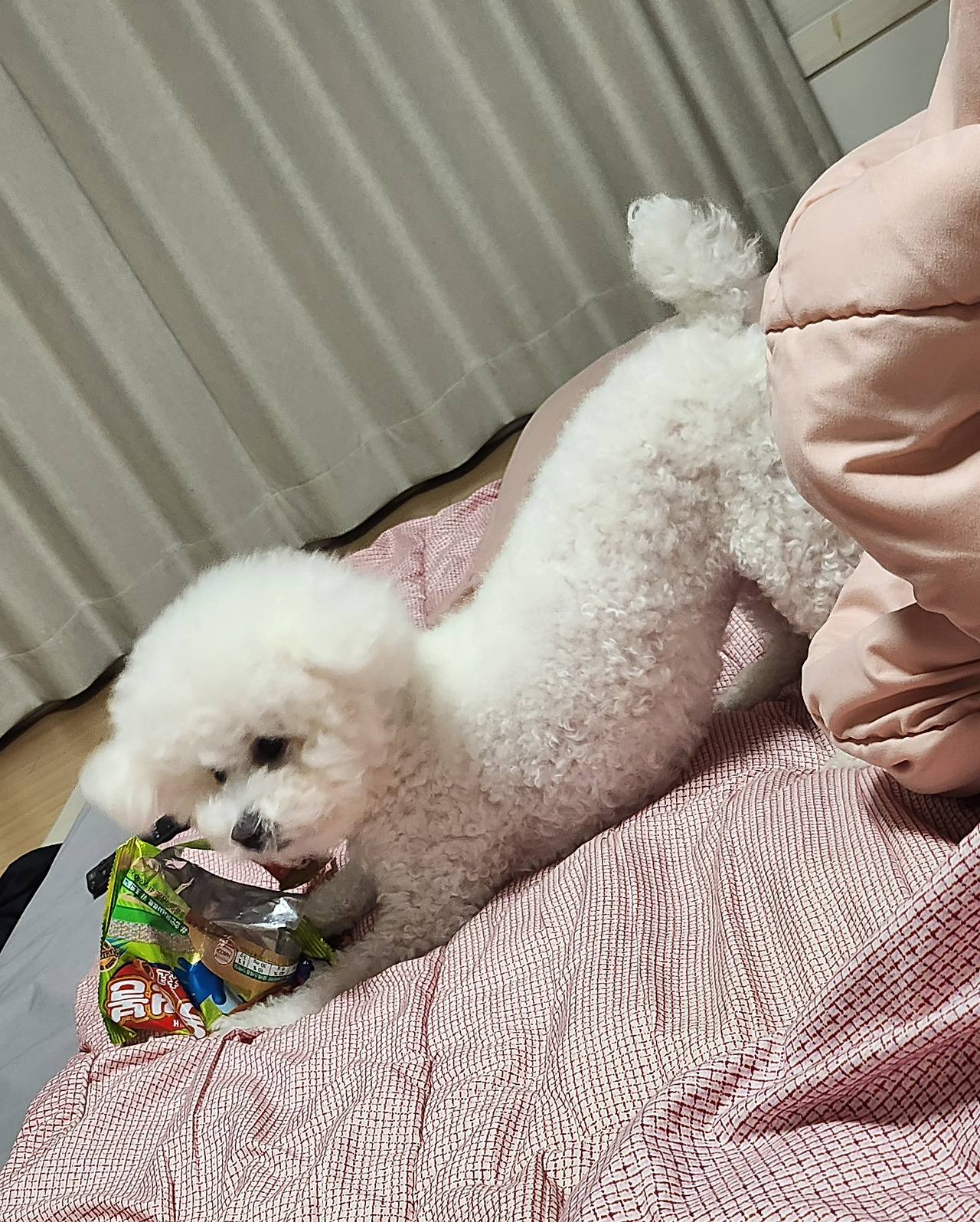 그중 크림이가 좋아하는 것은 먹고 버린 과자 봉지이다