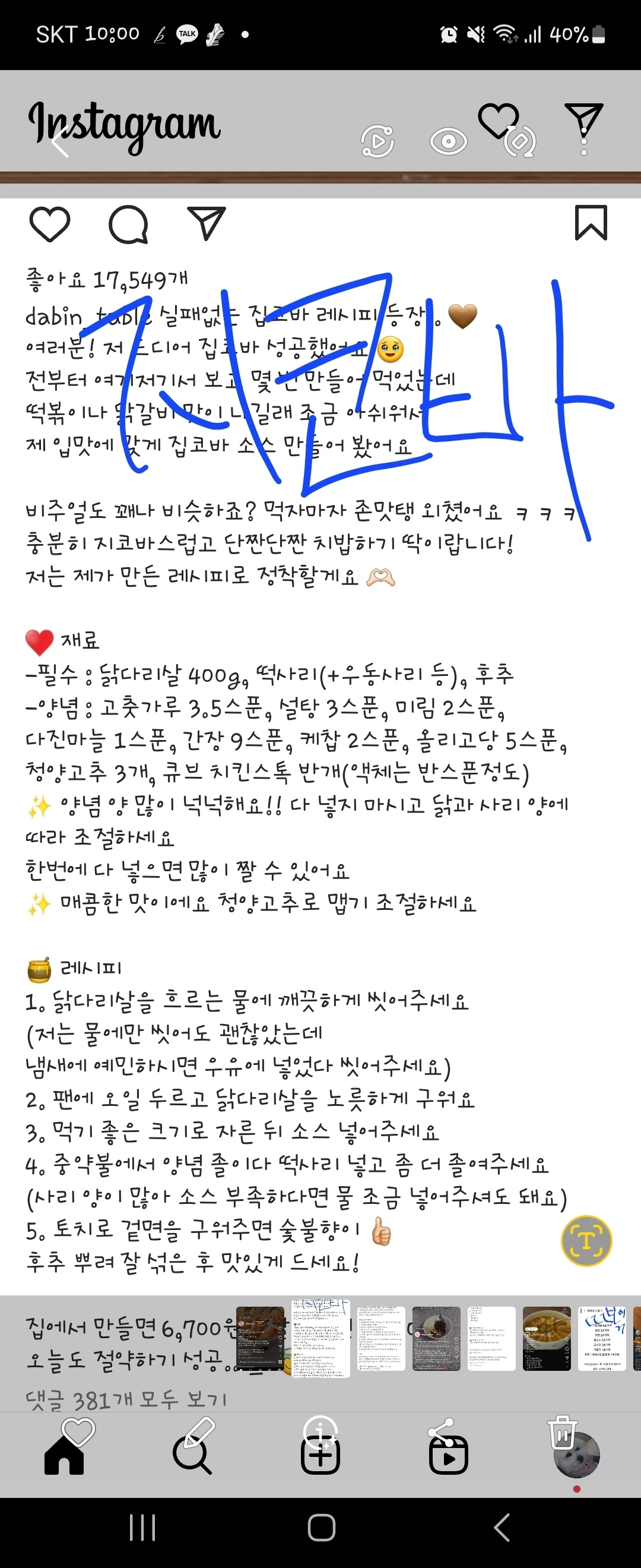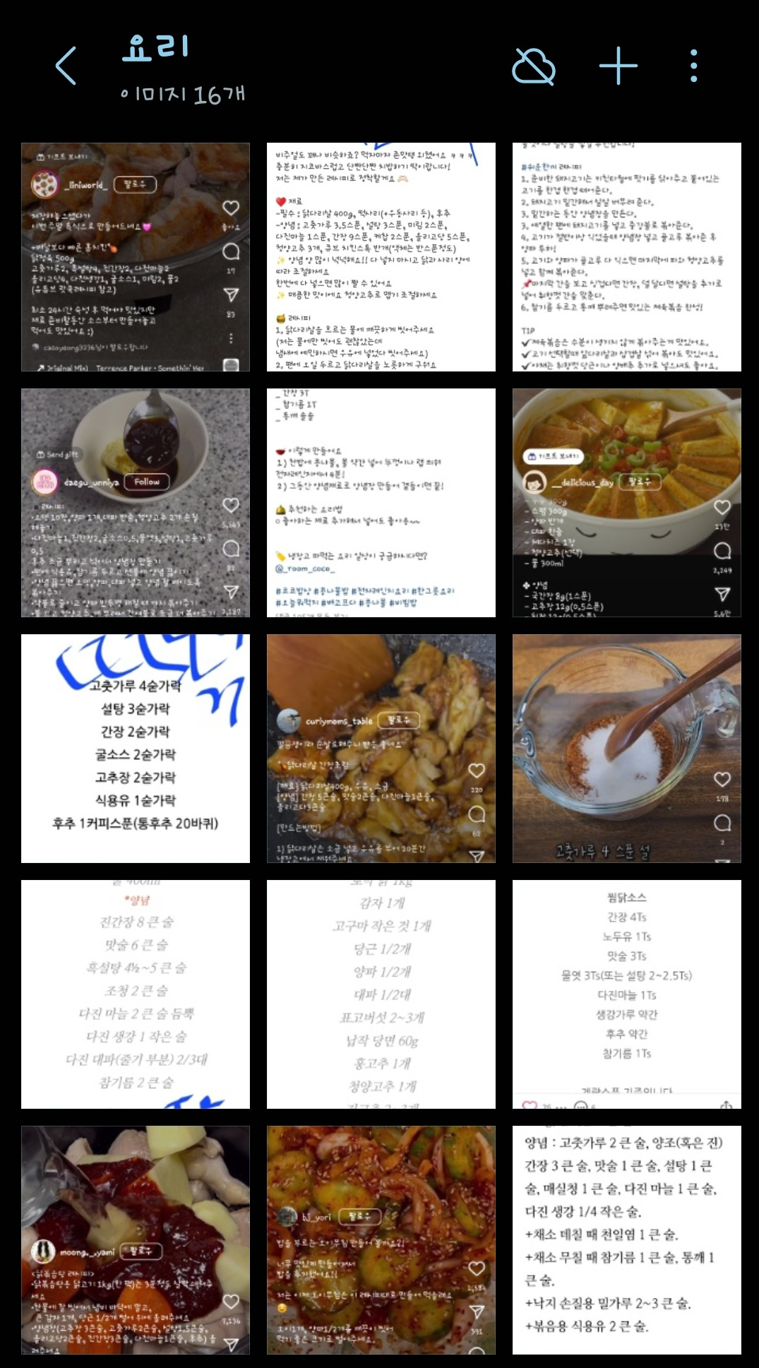 SNS 요리들을 캡처해 저장해 놓았다.