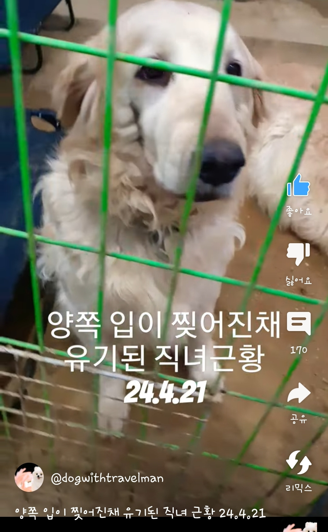 생후 10개월에 주인에게 유기당한 순둥 한 외모의 리트리머 직녀는 발견 당시 양쪽 입이 찢어지고 담뱃불로 여기저기 지진 흔적에 한쪽 발까지 부러진 상태였다고 한다.