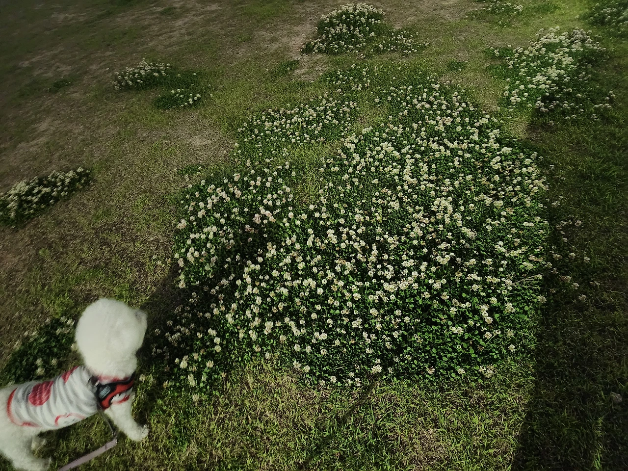 네 잎 클로버의 흰꽃과 초록잎이 조화롭게 어우러진 예쁜 장소로 날아가 버린 똥을 찾기 위해 휴대폰 손전등을 켰다.