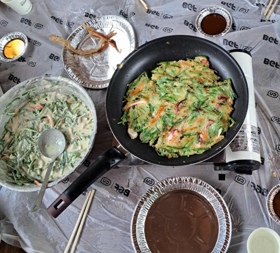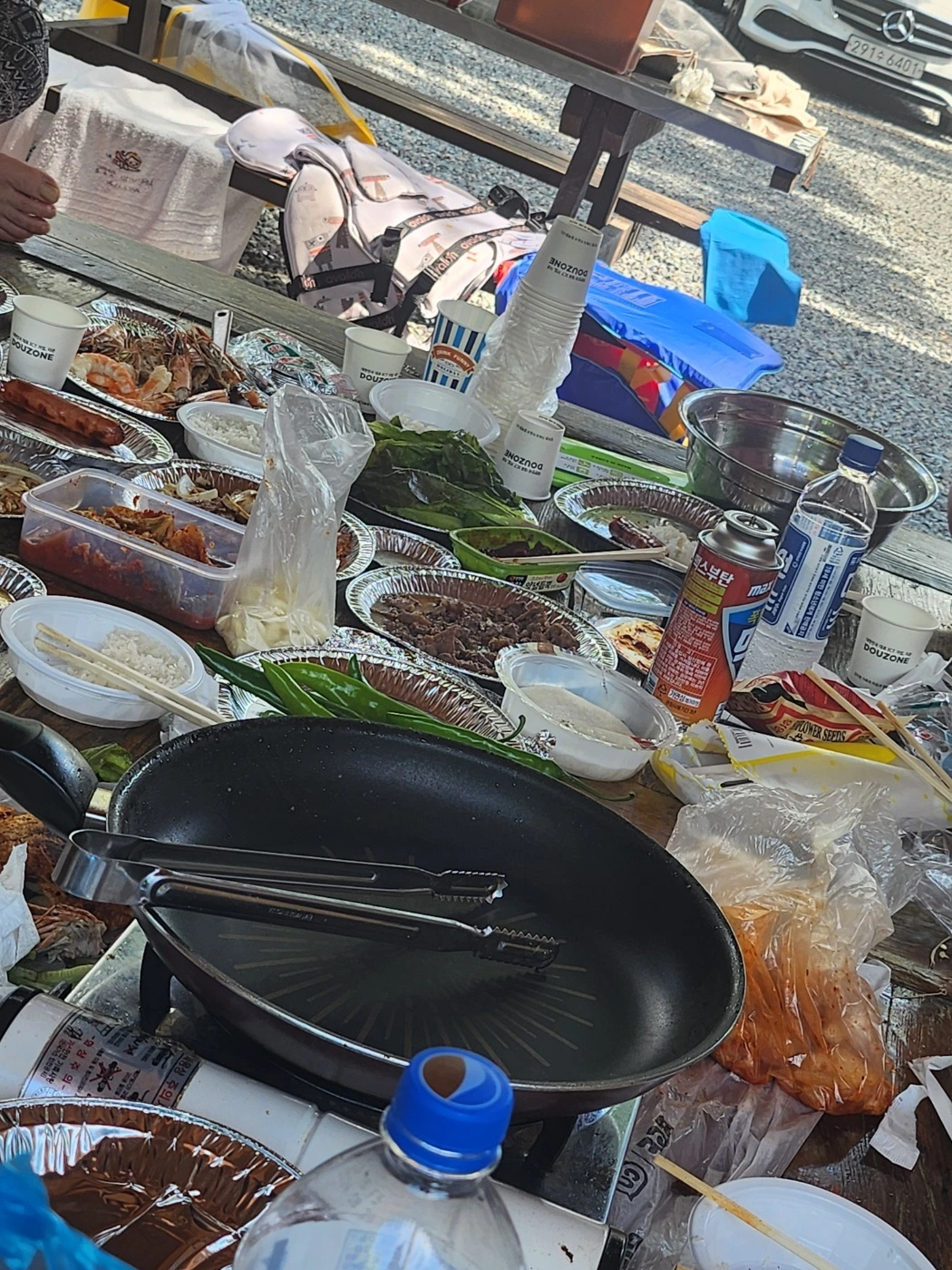 그리고 당일 아침 일찍 가스버너, 전기 그릴부터 온갖 주방용품을 챙겨 피크닉 장소로 갔다. 도착하자마자 아내와 재수 씨는 준비해 온 부추를 이용해 부추전을 굽고 H와 그의 남동생은 그 부추전을 안주 삼아 술을 마시기 시작했다.