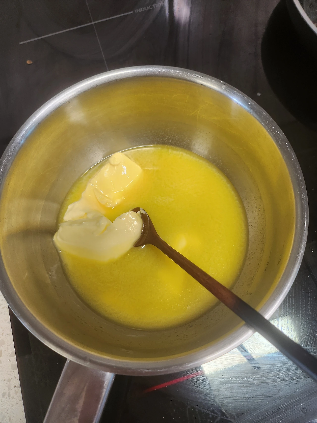 5. 끓인 헤이즐넛 버터가 50~60도 정도 됐다 싶을 때 세 번에 나눠 위의 섞인 재료에 부어 섞어 줘야 한다. 꼭세 번 나눠서 해야 한다.