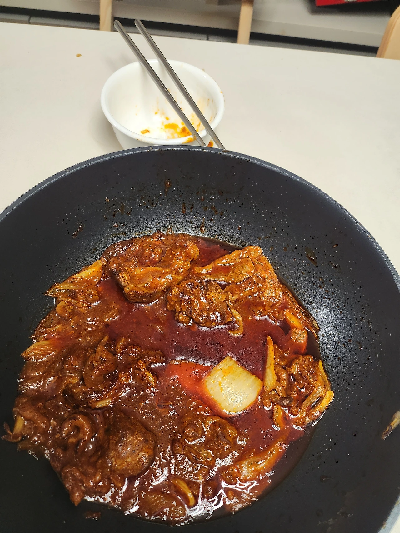 출근 전 볶아 놓은 오리 불고기를 데우지도 않고 식탁 중간에 두고 둘이 밥을 퍼서 먹은 흔적들이 내 눈에 들어왔다.