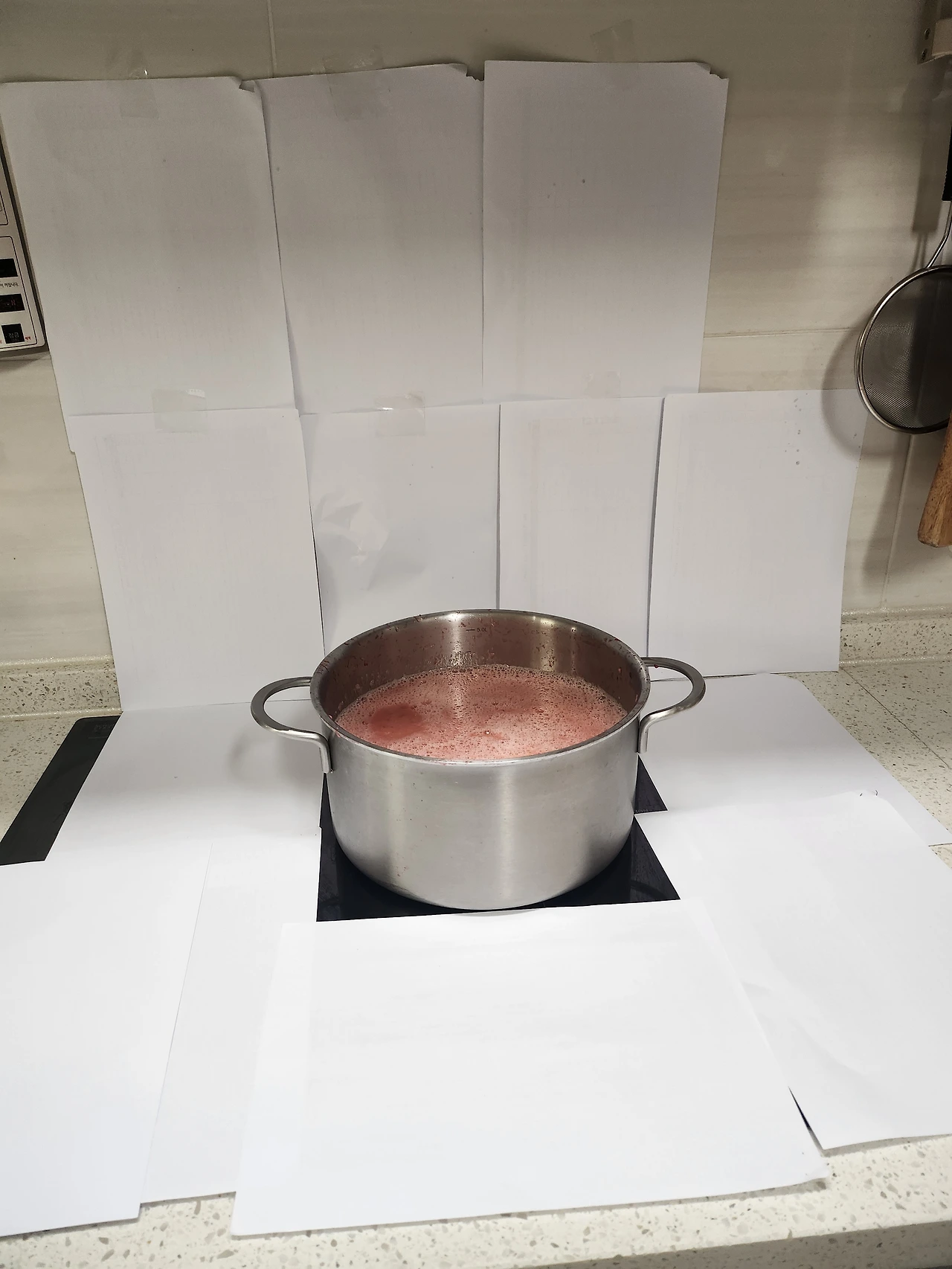 저는 이면지를 붙여 여기저기 튀는 끈적거리는 잼으로부터 인덕션과 타일을 보호할 예정입니다. 모양이 몹시 빠집니다. 요리 인플루언서는 못 할 듯합니다.