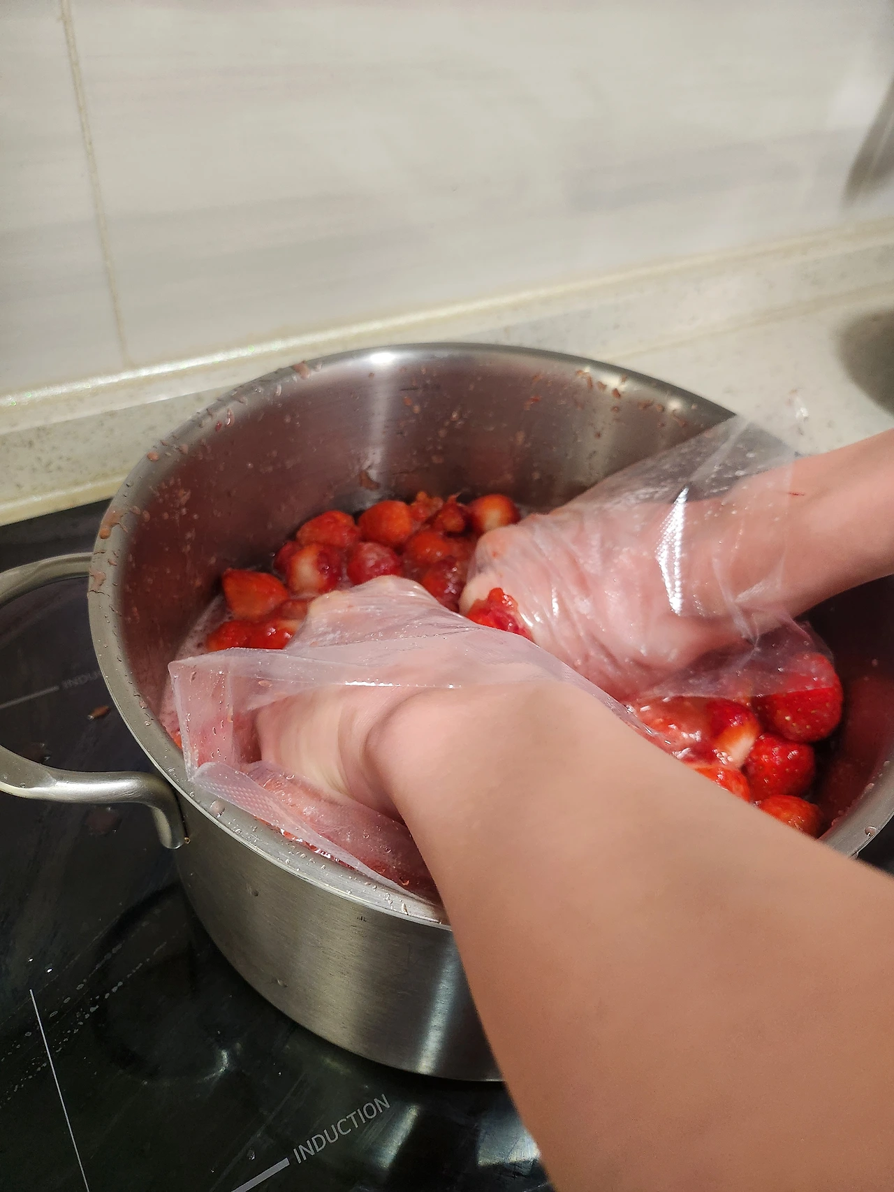 2. 씻은 딸기를 큰 냄비에 붓고 막 주물러 줍니다. 이때 나타난 중 3 아들이 팔을 걷어 부치고 촉감 놀이를 시작합니다. 아들 때문에 미운 사람 얼굴을 떠올리며 사정없이 으깨고 싶던 제 기회는 날아가 버렸습니다. 저는 부드러운 걸 좋아해서 블렌더로 한번 더 갈아 주었습니다.