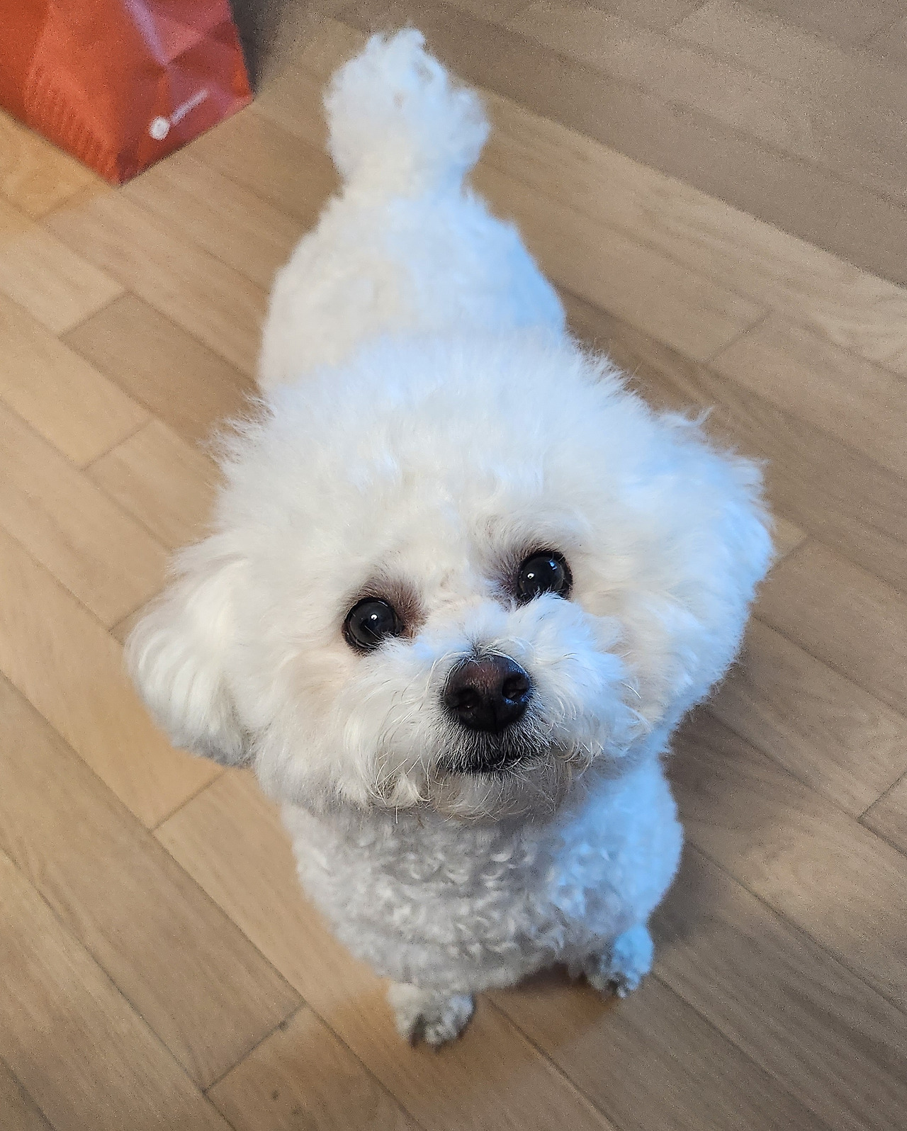 "비숑이죠? "라는 물음에 "얘, 푸들이에요."라고 대답하면 모두가 놀랄 정도로 비숑과 흡사하게 생겼다. 하지만 크림이가 비숑을 닮았건 , 푸들을 닮았건 , 어느 대에서 섞인 혼종이건 내겐 하나도 중요하지 않다.