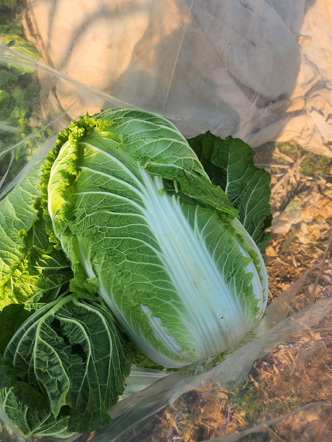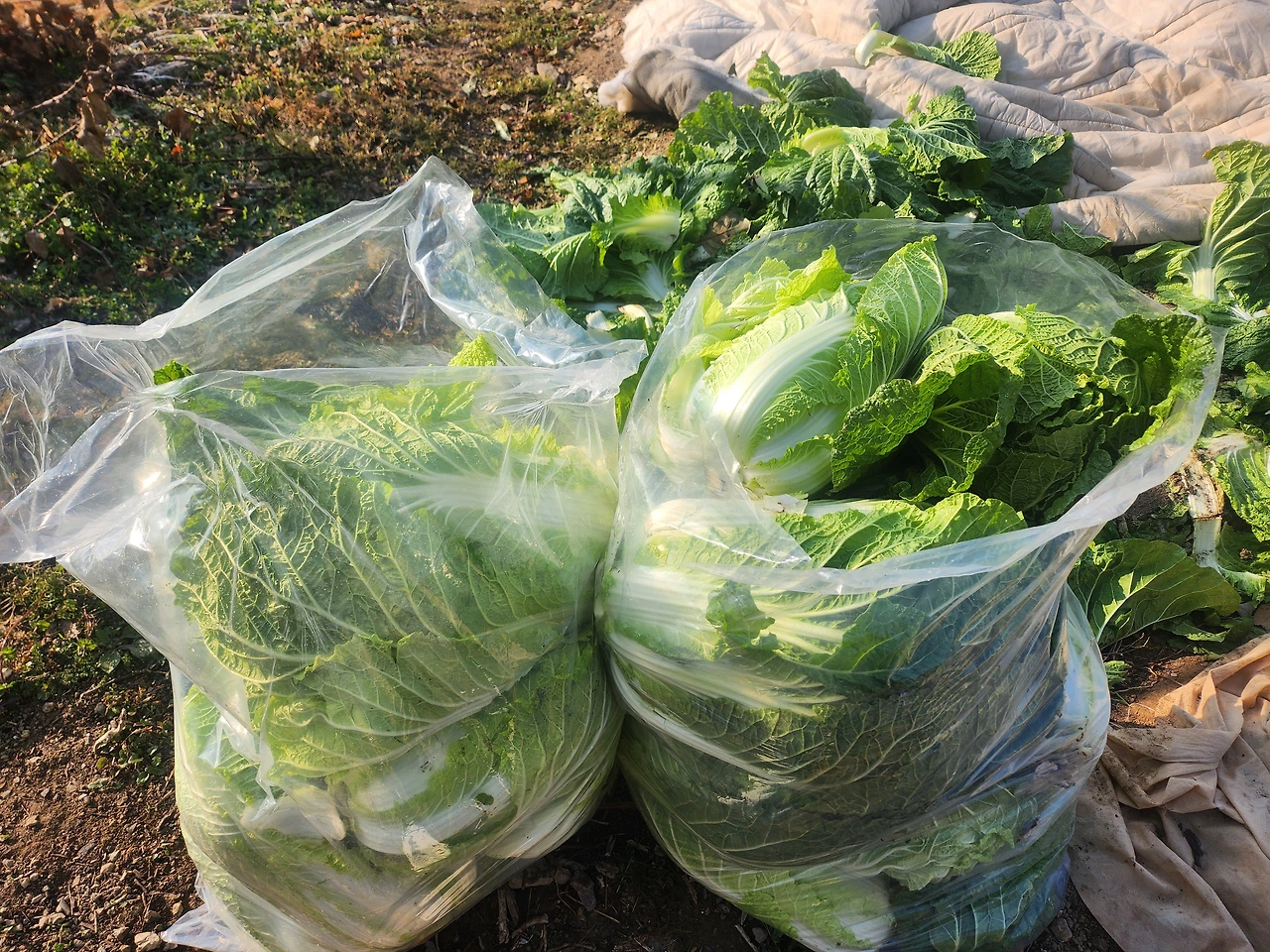 내 시어른들은 부산에 사시다가 아버님이 퇴직하신 후 고향인 함안으로 돌아와 밭농사를 짓기 시작하셨다. 그렇다고 농사를 전업으로 하시는 건 아니고 집터 여기저기에 땅을 일구어 식구들 먹을 정도로만 여러 가지 농작물을 기르신다. 고추, 깻잎은 기본이고 사과나무도 있어 지난여름에는 사과를 따 와서 맛있게 먹었다. 추석 명절에는 동서와 고추를 따와 집에서 맛있게 먹었고 단감도 얻어봐 잘 먹었다. 시부모님께서는 시댁집 입구 밭에 배추를 가득 심어 놓으셨다. 배추는 추위에 약해 얼어버리기 쉽다며 농사용 보온 덮개로 잘 덮어 놓으셨다. 이불 같은 덮개를 걷으니 초록초록 잎사귀의 배추들이 일렬로 나 있었다. 올해는 배추 농사가 풍년이었다. 처음 시부모님께서 밭농사를 지을 때만 해도 작물들이 너무 작고 알이 없어 초보 농사꾼 티가 났었다. 몇 해 지난 지금은 배추만 봐도 그 사이 얼마나 마음을 쏟아부으셨을지 알 수 있을 정도로 농사를 잘 지으신다.