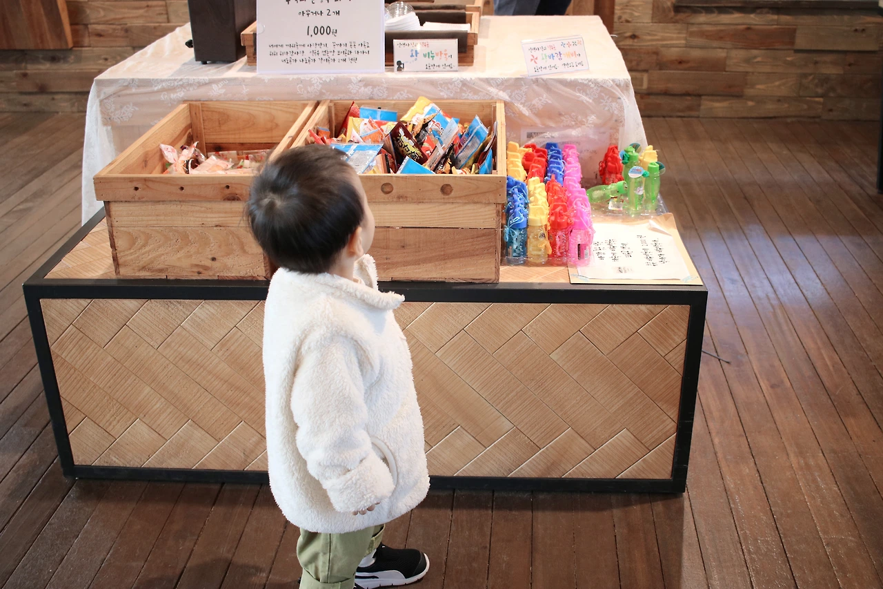 이 곳에서는 우리가 어렸을 때 가지고 놀던 물품들이 '나 안사면 후회할걸?'이라는 듯이 커피반 한가운데에 떡하니 자리 잡고 있고, 소품반으로 이동을 하면 더 많은 놀거리를 찾아볼 수 있답니다. 상자 안에 있던 즐겨먹던 간식들을 보자 저도 모르게 뒤적거리면서 제가 좋아하던 먹거리를 찾고 있더라고요(쫀드기와 아폴로를 득템 했죠). 저희 아이는 개월 수가 어리다 보니 처음 보는 것들이 너무 많고 신기한지 구경하느라 정신이 없었어요.