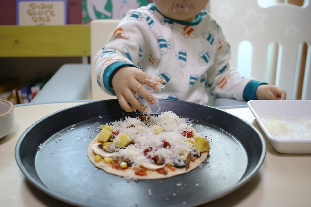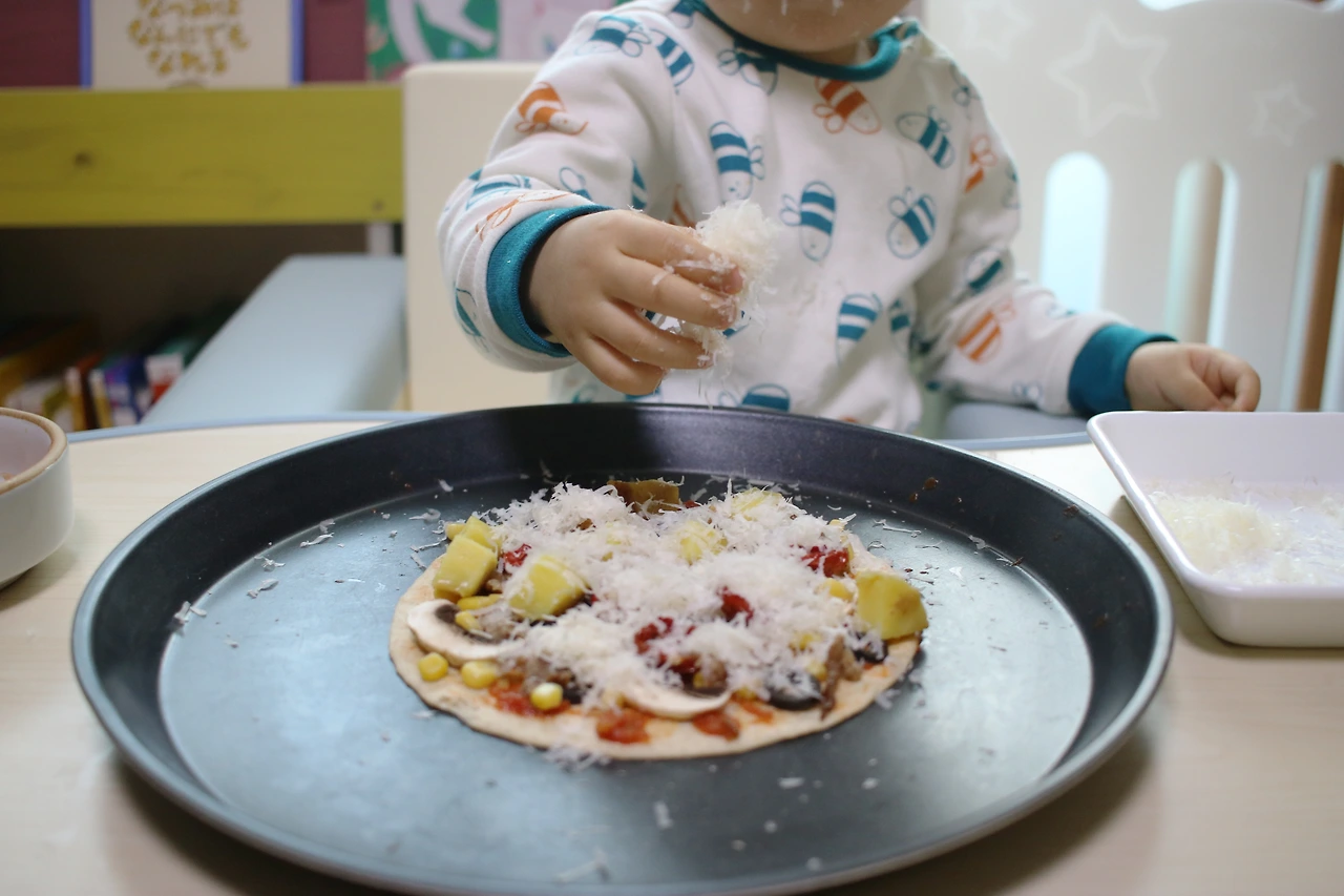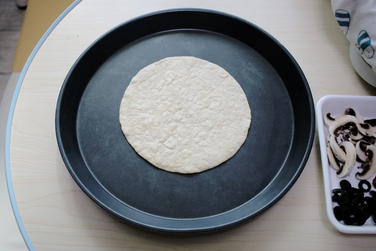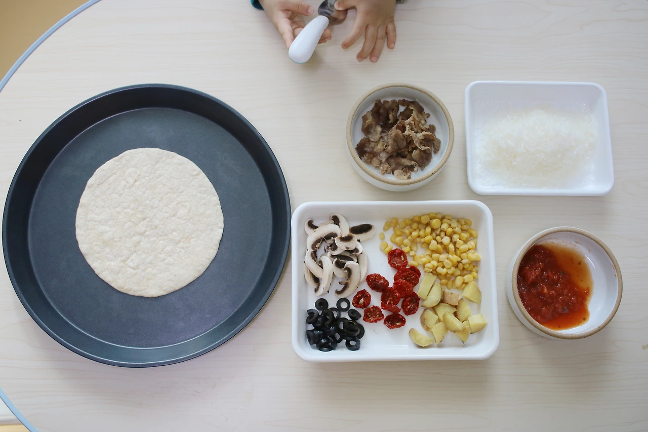 저는 통밀 또띠야를 사용했어요. 집에서 함께 도우를 만들까 생각도 했는데, 그 긴 시간을 가만히 앉아서 기다려 줄 인내심이 많은 개월 수가 아니기에 짧고 빨리 끝낼 수 있는 길로 가기 위해 위험을 무릅쓰지 않기로 했어요. 물론 밀가루로 직접 반죽을 만들면 아이들과 촉감놀이뿐만 아니라 부들부들한 가루도 만져보고, 물을 섞은 직후의 손에 끈적끈적하게 달라붙는 느낌과 매끈해진 반죽 표면을 손가락으로 꾹꾹 눌러보는 등 밀가루의 다양한 변화 모습을 함께 알아볼 수 있어요.