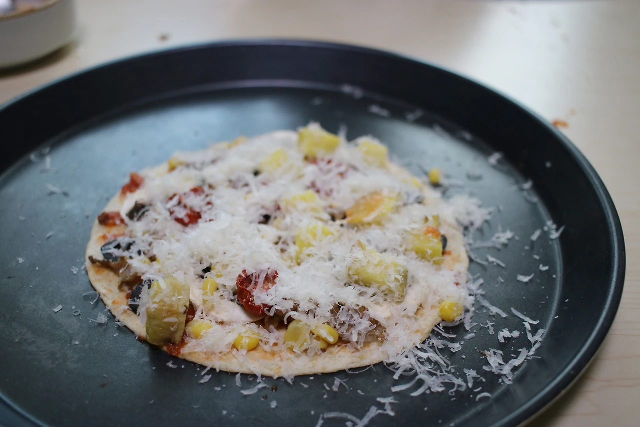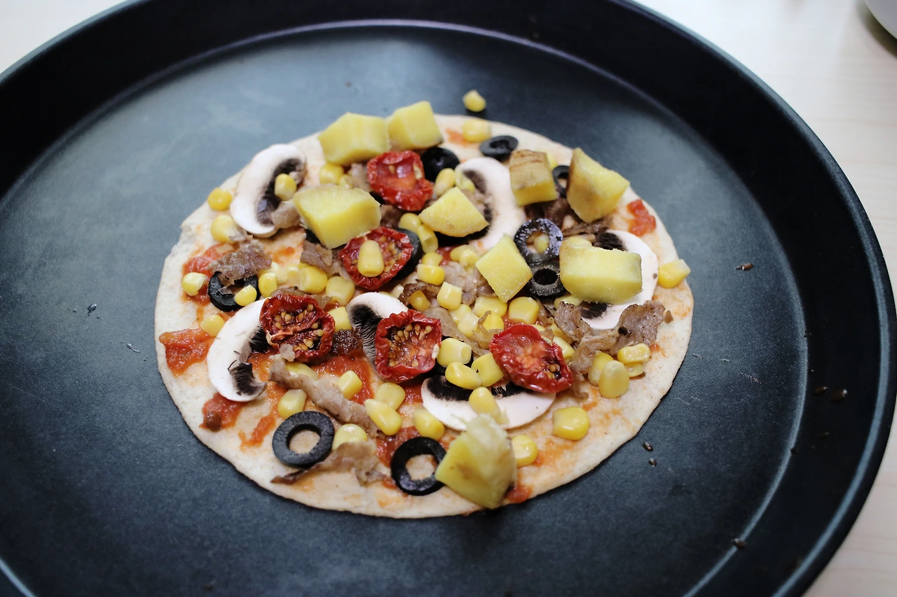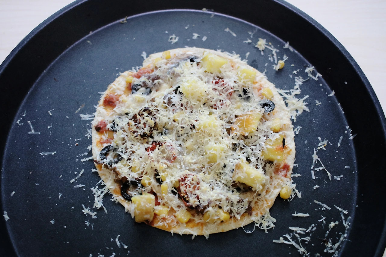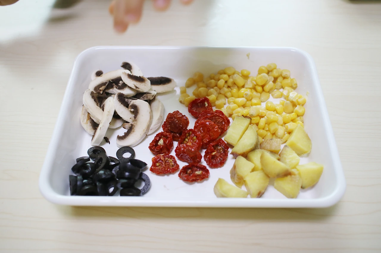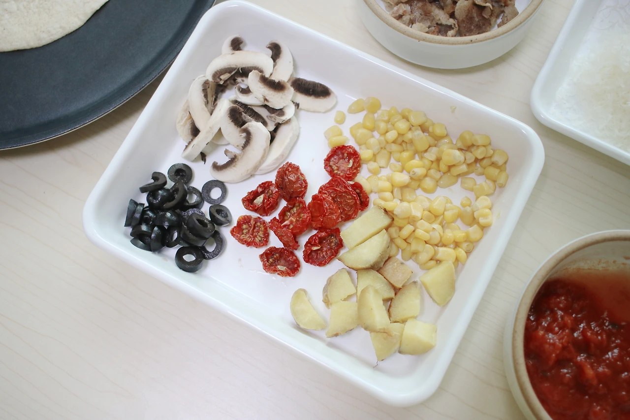 아이가 만든 피자 토핑이에요. 지금 생각해 보면 토마토소스를 바른 후에 치즈를 한번 뿌려주고 재료들을 올려주는 게 먹을 때 재료가 또띠야에서 떨어지지 않고 잡아주는 접착 역할을 할 것 같아요. 보시면 아시겠지만 고구마가 한쪽으로 몰려있는 게 보이시죠? 아드님은 반쪽만 고구마 피자로 만들고 싶었나 봐요.