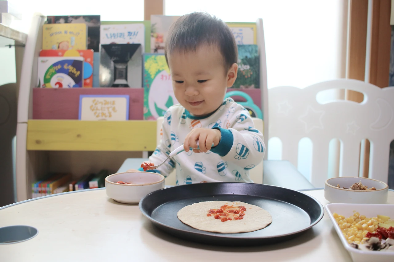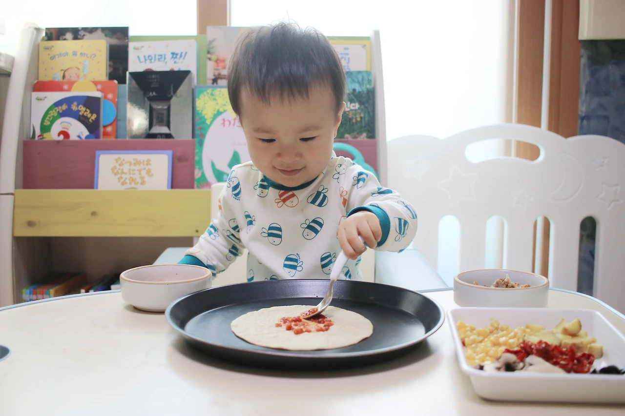 토마토소스는 토마토 특유의 새콤한 맛이 있어서 많이 바르게 되면 맛이 과해져서 다른 식재료의 맛은 나지 않고 토마토 맛만 잔뜩 날 수 있으니 적당량 펴 발라주세요. 신나 하는 표정 보이시나요? 저가 먼저 한번 시범을 보여주면서 관찰하게 한 다음, 본인이 스스로 해보게 했어요. 완벽하진 않지만 수저로 소스를 퍼서 또띠야 위에 놓은 다음에 수저로 툭툭 치더라고요. 아직까지 펴 바르는 건 무리였나 봐요ㅋㅋ