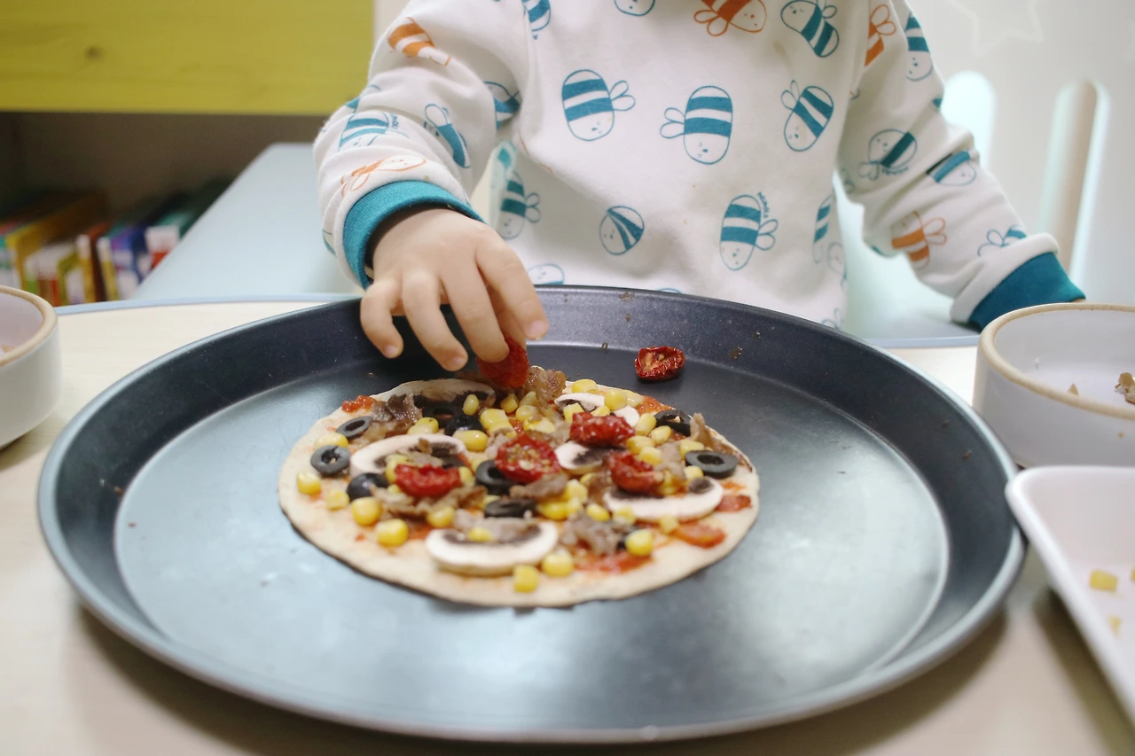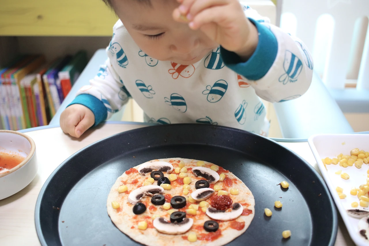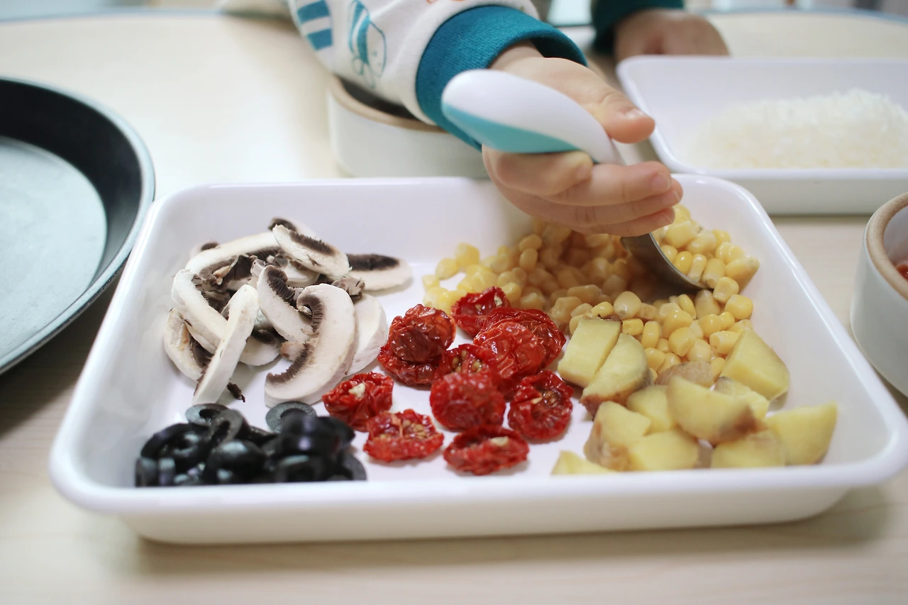 토마토소스를 바르기 위해서 준비한 수저로 본인이 좋아하는 옥수수 한 스푼을 크게 집으시는 아드님. 아이랑 요리놀이를 하기 전에 알아두셔야 하는 점이라 하면 만드는 과정 중에 집어 먹는 게 더 많다는 거예요. 여기에서 스트레스를 받으신다면 다음 음식놀이 수업을 진행하고 싶은 마음이 들까요?