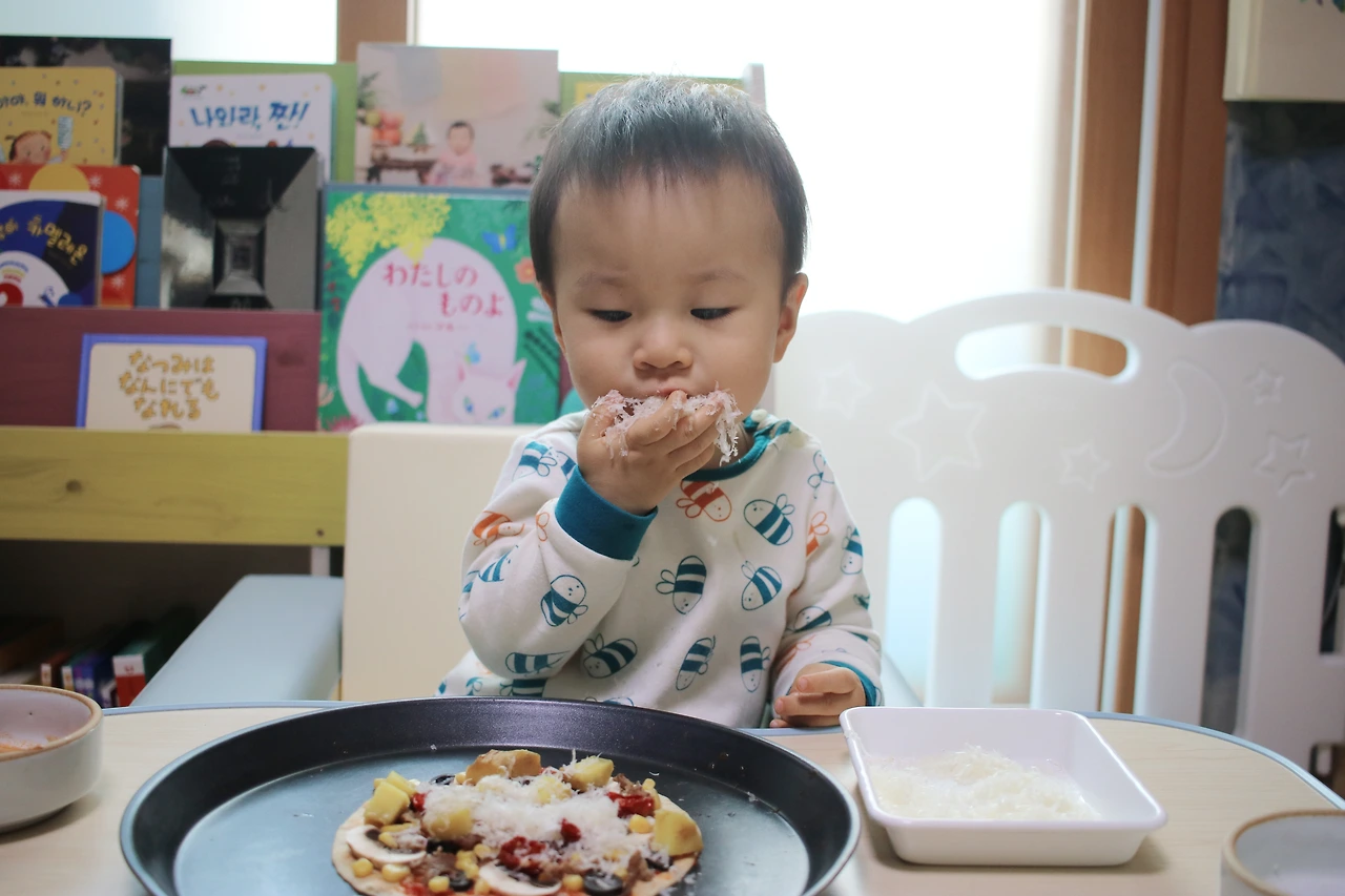 윗 사진에 입에 달라붙어 있는 치즈가루들이 보이시나요?ㅎㅎ 그래도 먹으면서도 어느 정도의 치즈는 올려주더라고요. 치즈가 올라가야 맛있다는 걸 본인도 아는 거겠죠? 아이가 치즈를 다 올린 후에 비어있는 부분은 제가 치즈를 더 올려서 마무리를 해줬어요.