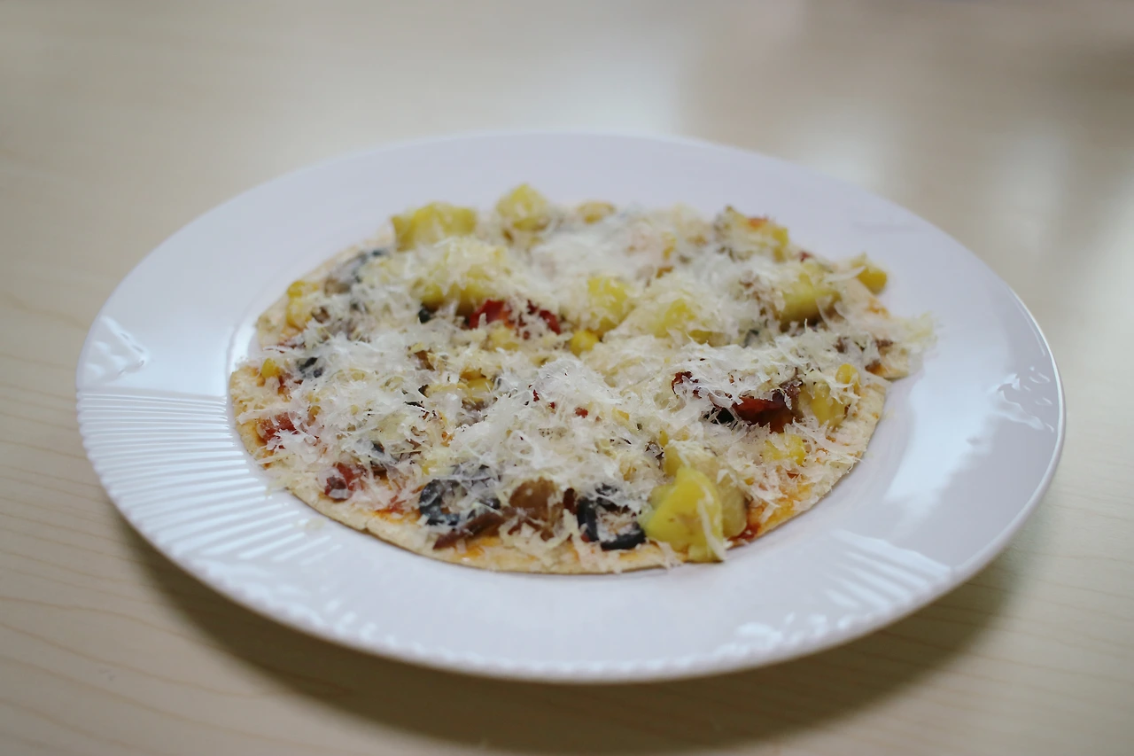 노릇하게 구워져 나온 피자. 또띠야도 칼로 쓱 자르면 바삭하고 잘려요. 저는 이렇게 나오는데 고구마가 파인애플처럼 보여서 군침이 돌더라고요ㅋㅋ