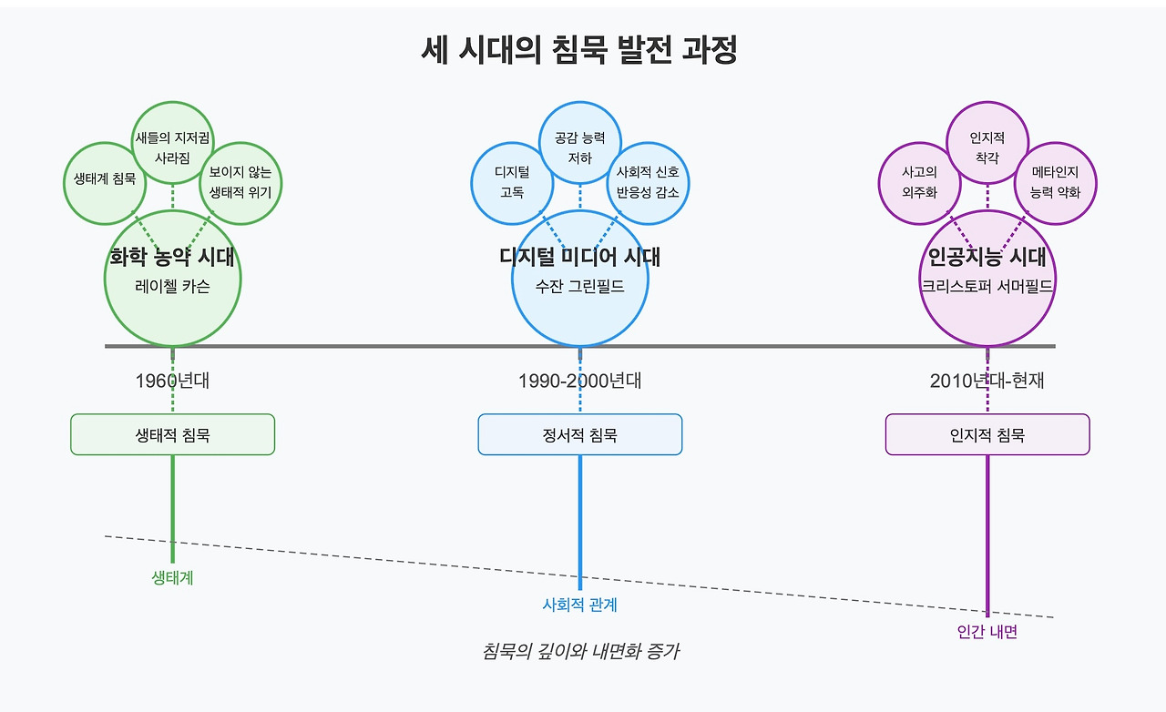 - 레이첼 카슨이 『침묵의 봄』에서 주장했던 '감각적 침묵'과 연결되고, 생성형 AI가 상용화된 현시점에서는