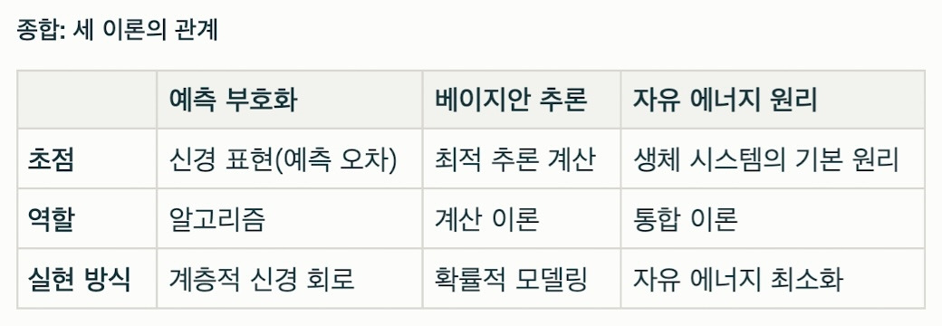 이는 예측 부호화, 베이지안 추론, 자유 에너지 원리라는 세 가지 핵심 이론으로 설명된다.