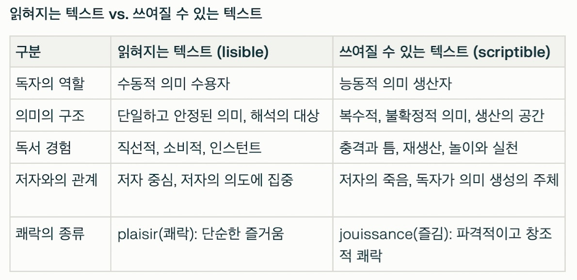 롤랑 바르트가 말한 ‘쓰여질 수 있는 텍스트’(scriptible)란 독자가 단순히 저자의 의도를 해석하고 소비하는 수동적인 존재에 머무르지 않고, 텍스트와 적극적으로 상호작용하며 새로운 의미를 창조해 내는 능동적 주체가 되는 열린 텍스트를 의미한다.