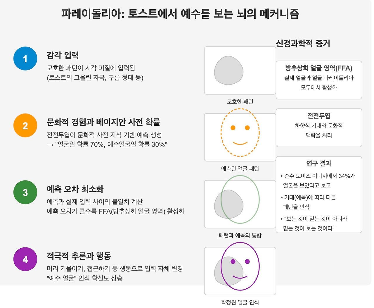 - 예측 오차 최소화: 실제 감각 입력과 예측 사이의 불일치(예측 오차)가 계산된다. 이 과정에서 우리 뇌의 방추상회 얼굴 영역(FFA)이 활성화된다. 연구 결과에 따르면, FFA는 실제 얼굴을 볼 때뿐만 아니라 얼굴 파레이돌리아가 발생할 때도 특이적으로 활성화된다.