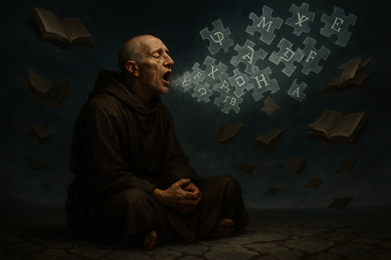 수도원의 언어는 엄격한 라틴어 문법과 신학적 해석의 틀 안에 갇혀 있다. 반면 살바토레의 언어는 규칙 없이 자유롭게 흐른다. 그 불규칙함이 오히려 무한한 해석의 가능성을 품고 있다.