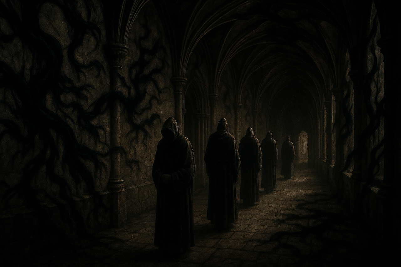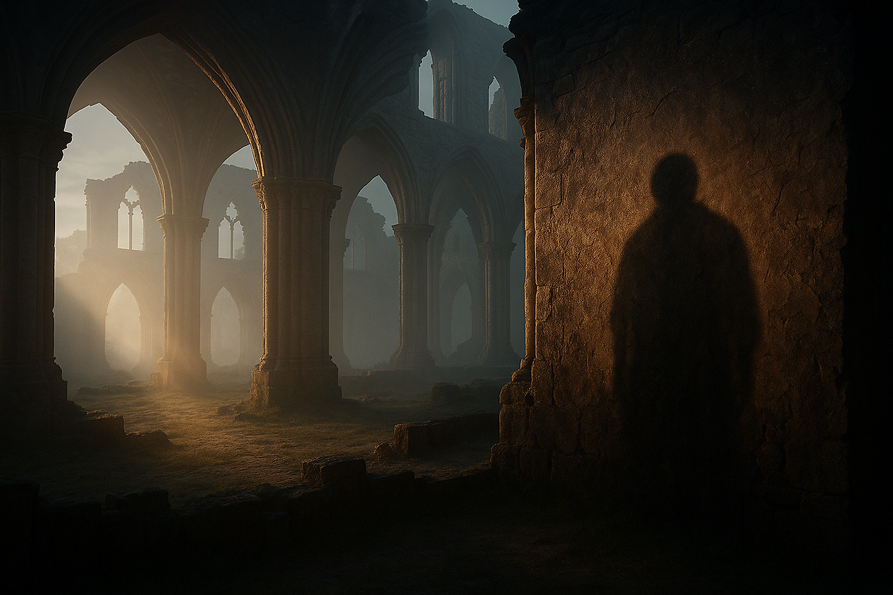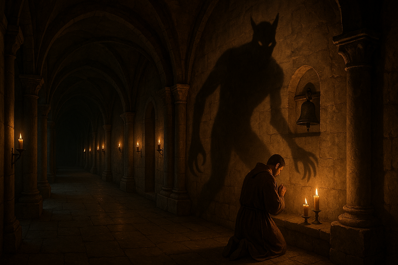 회랑을 가로질러 걷는 한 수도사의 발걸음은