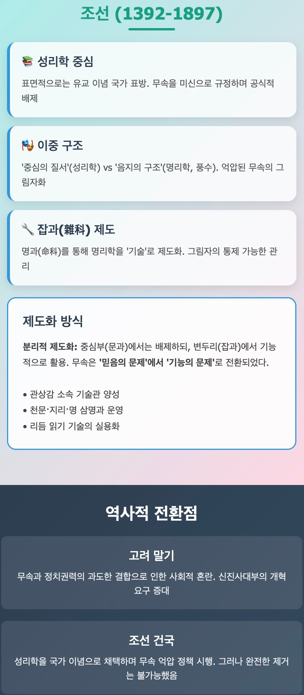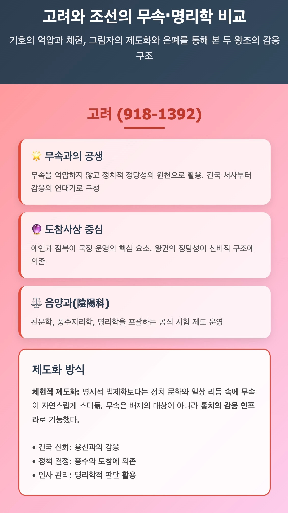 조선이 무속을 억압하면서도 철학적 언어로 재해석하려 했다면,