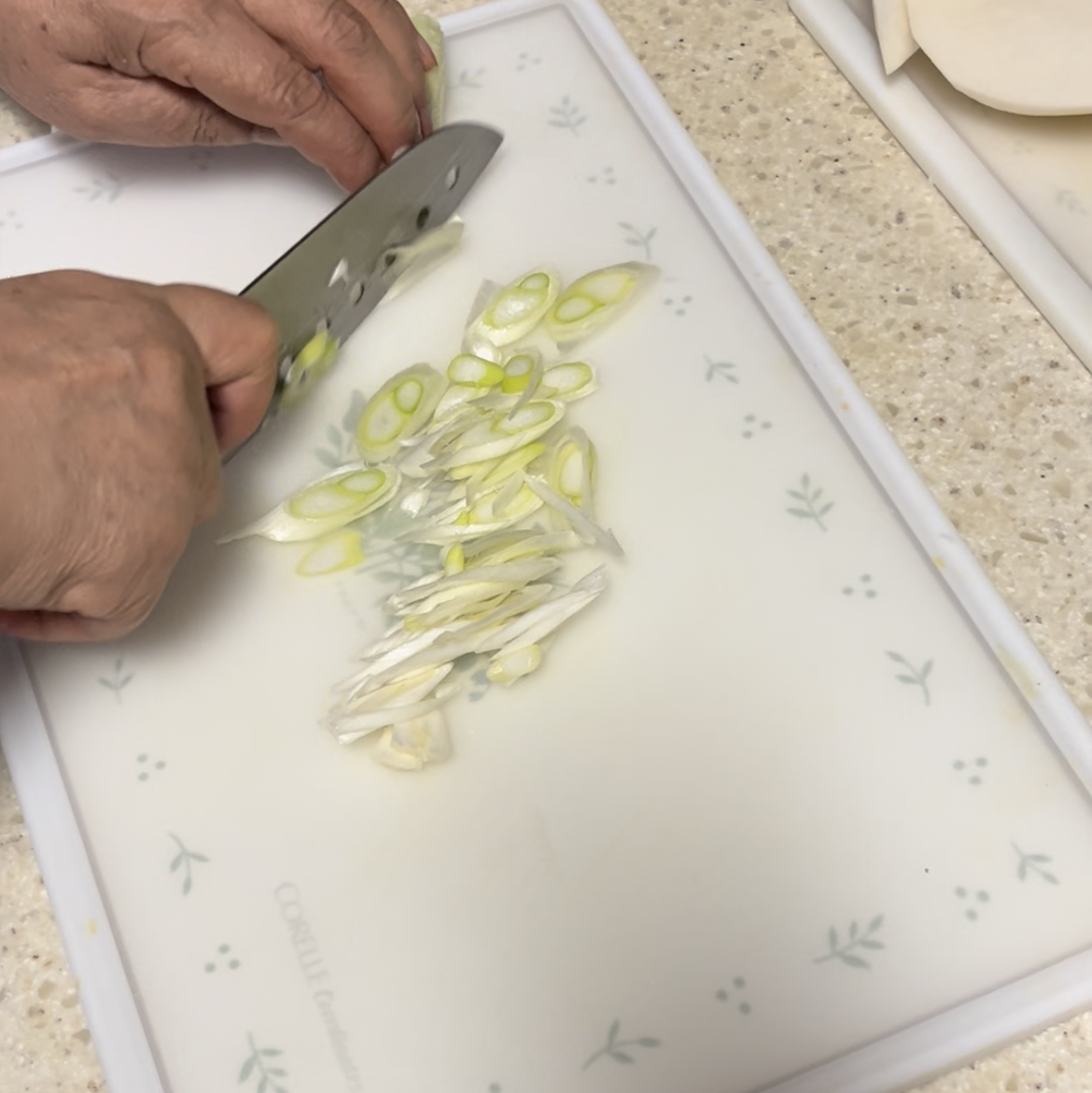 파도 썰어줍니다. 초록색 이파리를 넣으면 색이 예쁩니다.