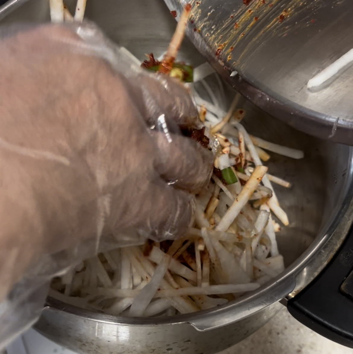 미리 만들어둔 양념과 무채를 섞어줍니다.