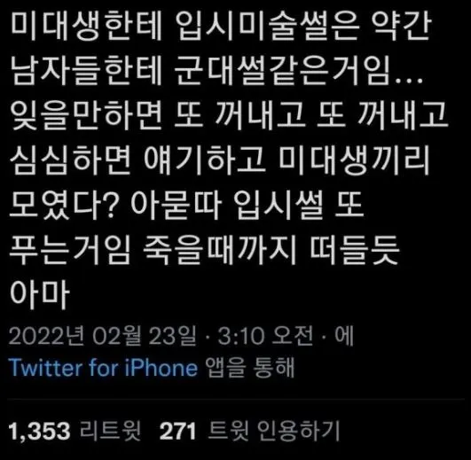 자의 반 타의 반이었던 재수로 미대입시를 무려 두 번이나 치르고 대학 입학과 동시에 입시 강사로 두 해를 보냈다. 강사로 일하면서 많은 학생들을 만났지만 그중 유독 나를 잘 따랐던 여학생이 있었다. 그녀는 유리멘탈에 그림 실력마저 우수하지 못해 애물단지가 따로 없었다. 전임 선생님에게 조금이라도 혼난 날엔 어김없이 나를 찾아와 울곤 했다. 그녀에게 말했다. 네 삶에 너무나도 중요한 순간인 점은 맞지만 그림에 쓰인 점수가 너의 삶에 대한 점수가 아닌 점은 기억하라고. 물론 그녀는 계속 울었지만 말이다.