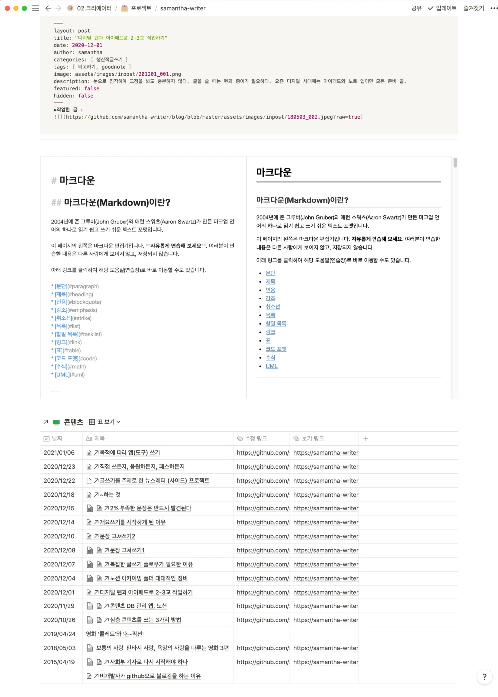 마크다운 문법 기반으로 동작하는 노션과 최대한 입력 서식이 비슷한 플랫폼을 사용하고 싶었습니다.