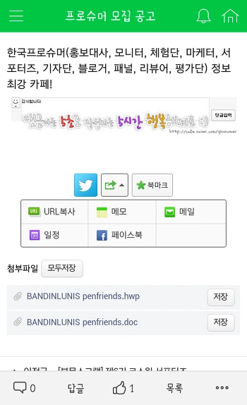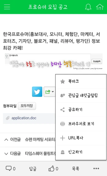 따라서 모바일에서 네이버 콘텐츠를 보다가 괜찮다 싶은 것들은 일단 페이스북으로 공유한 뒤, 나중에 여유가 있는 저녁이나 아침 근무 전에 PC에서 해당 콘텐츠를 확인한다. 네이버 카페 앱을 기준으로 이 방법에 대해 설명하고자 한다.