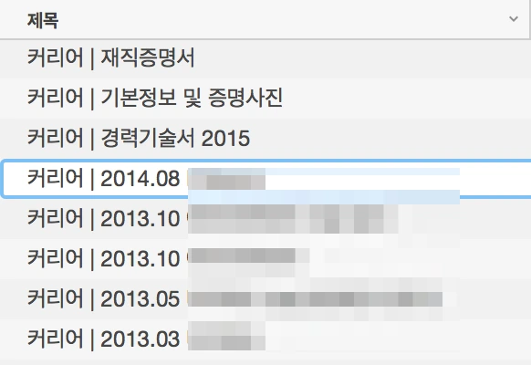 재직증명서의 경우에는 반드시 필요하지는 않지만, 대출을 받거나 신용카드를 만들 때 금융기관에서 요구하는 자료이기도 하다. ‘원본’ 자료를 요구하는 곳이 많겠지만, 그래도 에버노트에 만약을 대비한 백업을 해두는 것이 중요할 것 같아서 넣었다. 경력기술서의 경우 매년 또는 분기별로 업데이트하면서 자신의 업무성과를 스스로 고찰해보는 용도로 사용하면 좋다. 나머지는 프로젝트 또는 입사연도별 각 회사에서 맡았던 일이나 업무에 관한 자료 등을 첨부하고 적절한 제목을 붙인다.