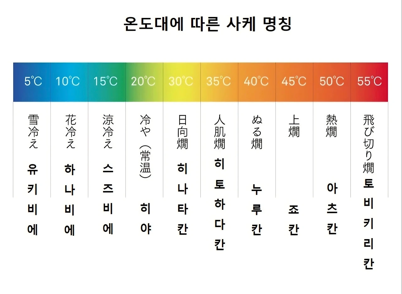 애주가라면 잘 아는 사실이지만, 술은 온도에 따라 맛이 달라지는 대표적인 음식이다. 그래서 술마다 가장 맛있는 적정 온도라는 게 존재한다. 맥주는 보통 4~10도, 와인은 실온인 12~15도가 적당하다고 한다. 하지만 사케는 다양한 온도로 마시는 것이 가능한 술이다. 차게 마시는 사케를 레이슈(冷酒, Reish), 상온을 히야(冷や, Hiya), 뜨겁게 데워서 마시는 술을 칸자케(燗酒, Kanzake) 이렇게 따로 부르는 이름이 있을 정도다.