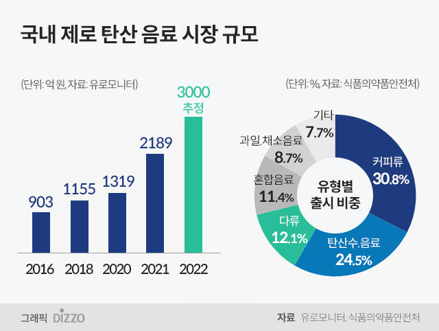 유로모니터 조사 자료에 따르면 국내 제로 음료 시장 규모는 2018년 1,630억원에서 2023년 1조2,780억원으로 7.8배 성장했다. 코트라(KOTRA)는 얼라이드마켓리서치 논문을 인용해 전 세계 제로 탄산음료 시장은 매년 7.3%씩 커져 2030년에는 2,435억달러(약 360조원) 규모로 성장할 것이라는 전망을 내놓기도 했다. 제로슈거 트렌드는 아직은 음료시장을 중심으로 형성되어 있지만 주류, 디저트, 심지어 인스턴트 식품 시장까지 영역이 확장될 것으로 예상된다.