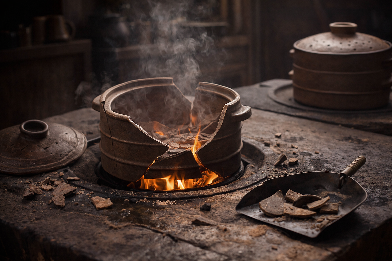 '破(깨뜨릴 파), 甑(시루 증), 不(아닐 불), 顧(돌아볼 고)' 깨진 시루는 돌아보지 않는다는 의미에서 유래한 고사가 바로 '파증불고(破甑不顧)'다.