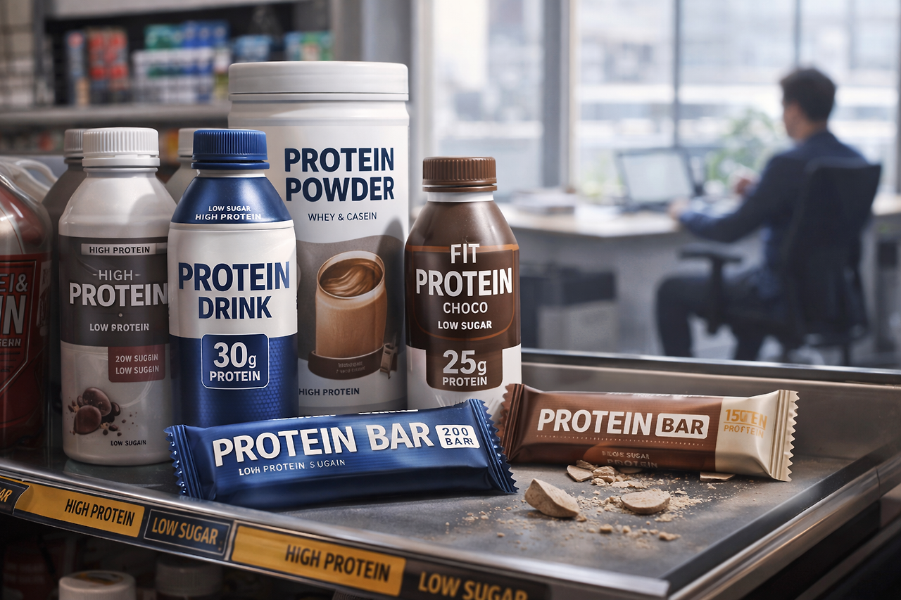 예전엔 초콜릿과 탄산음료가 있던 자리에, 이제는 단백질 바와 고단백 음료가 줄지어 서 있다.