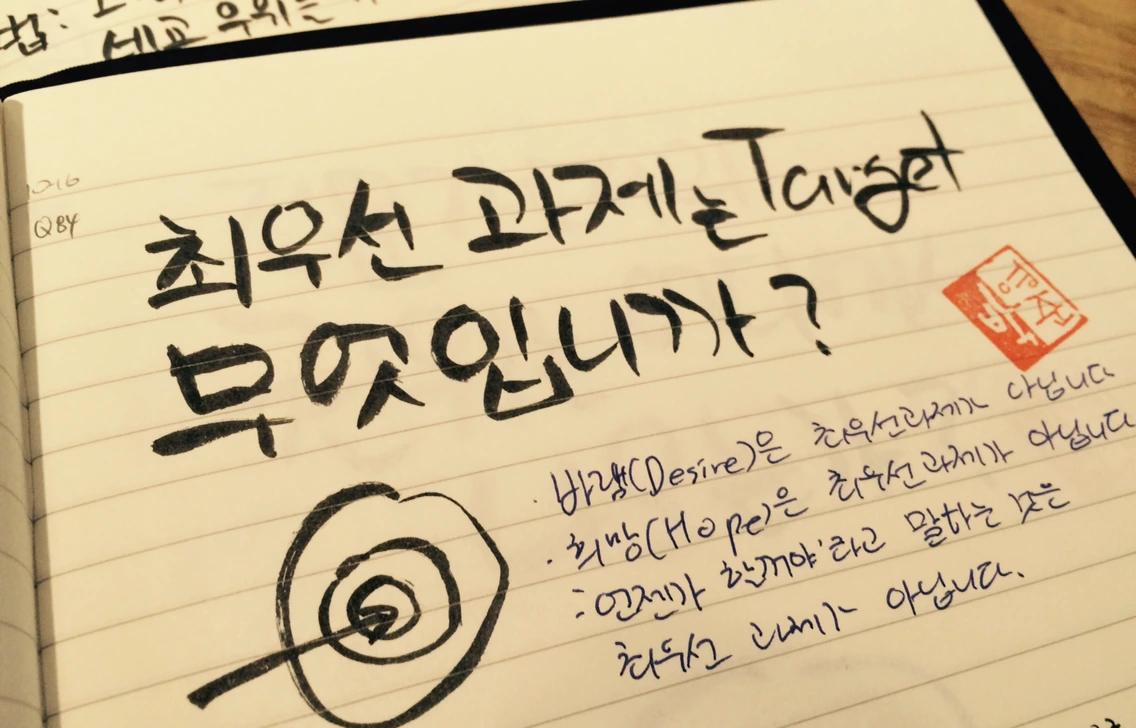최우선 과제(Target)는 바램(Desire)이나 희망(Hope)과는 다릅니다. 구체적으로 특정 기간까지 조직의 미션과 비전을 달성하기 위해서 무엇을 해야 하는가? 혹은 지금 집중해야 하는 올바른 일이 무엇인지에 대해 답하기를 요청하는 것입니다.