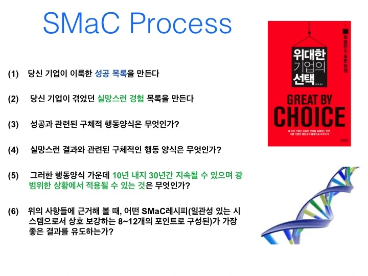 리더가 팀원들이 일을 올바르게 하도록 도우려면 무엇을 해야 할까요? 해당 팀원들이 해야할 가장 기본적인 일이 무엇이고, 그 일을 잘한다는 것이 무엇인지에 대한 '올바른 기준'을 제시해 주어야 합니다. 예를 들어 "전략을 가지고 일을 해라."라고 말하는 것이 아니라, "핵심 사업의 성공을 위해 우리가 집중할 최우선 과제 3가지를 설정하고 있는가?"라고 물을 수 있어야지요. 짐 콜린스가 [위대한 기업의 선택]에서 이야기 한 'SMaC레시피' 같은 것을 만들어보게 하는 것도 좋습니다.