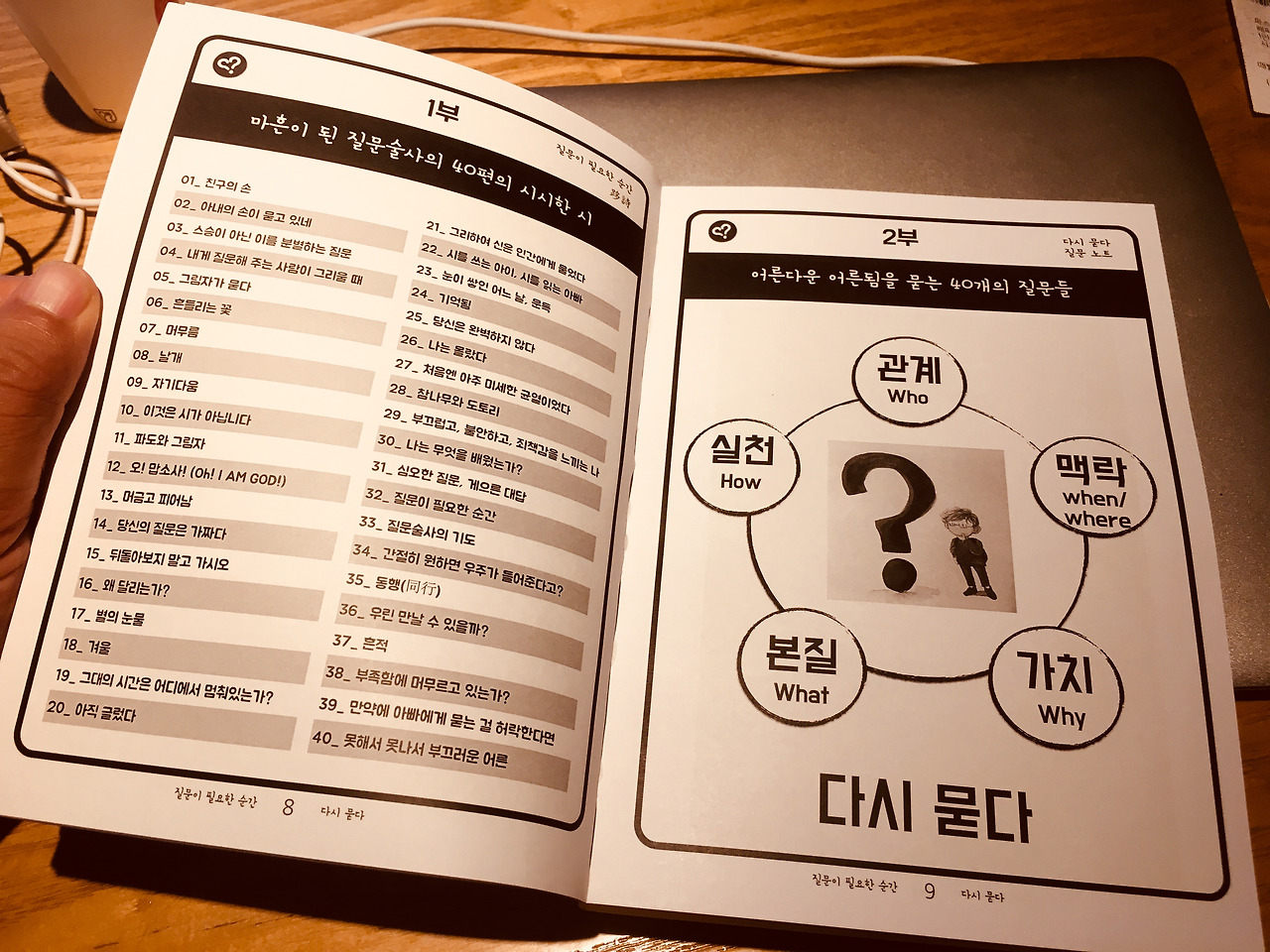 마흔된 기념으로 출간하는 책이다 보니 40편의 시, 어른됨을 묻는 40개의 질문을 정리했고, 피드백 및 추천을 주실 분들도 40명에게 받을 계획이다. 유명한 분들의 추천사가 아니라, 질문이라는 주제를 좋아하는 벗들에게 받는, 다시 말하다면 독자들의 추천사를 받아서 책에 넣고 싶다.