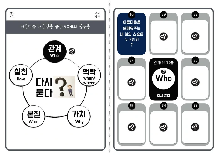 어른다움을 묻는 '다시 묻다 질문 노트'는 다섯개의 주제로 이루어졌습니다. 오늘은 그 첫번째 키워드인 '관계'에서 시작해보려고 합니다. 저의 경우엔 '관계에 얽힘'을 새로운 눈으로 바라볼 때, 새로운 관계에 손을 내밀때 삶이 조금씩 달라지곤 하더군요. 앞으로 8주간, 나를 나답게 만드는 관계를 다시 한번 살펴보았으면 합니다. (참고로 질문은 40번부터 시작해서 1번으로 끝나게됩니다)