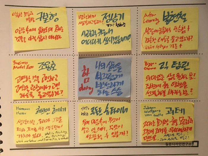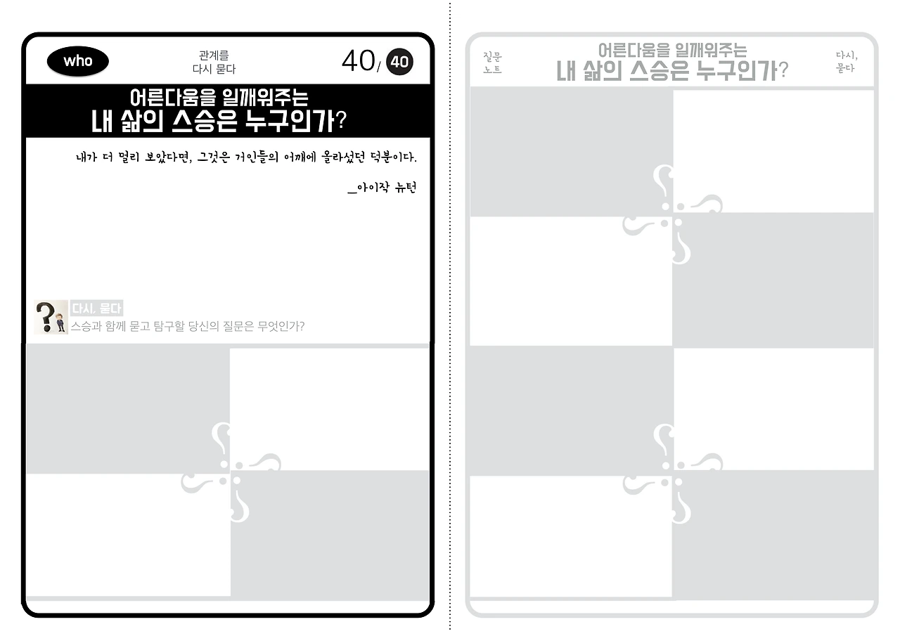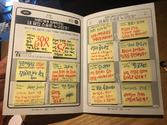 혼자 답을 채워가도 되고, 친구들 몇몇이 모여서, 서로의 스승이 누구였는지 묻고 함께 대화 나누는 시간을 가져봤으면 좋겠습니다.