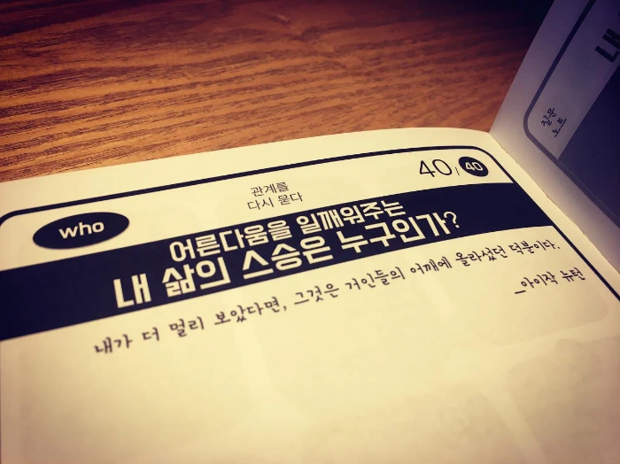 어른다움을 묻는 첫 번째 질문에 대해 여러 고민을 해 봤는데, 배우길 좋아하는 저는 '삶의 스승'을 첫 키워드로 삼아 다음과 같은 질문을 제안해 봅니다.