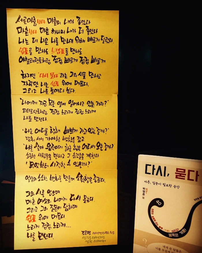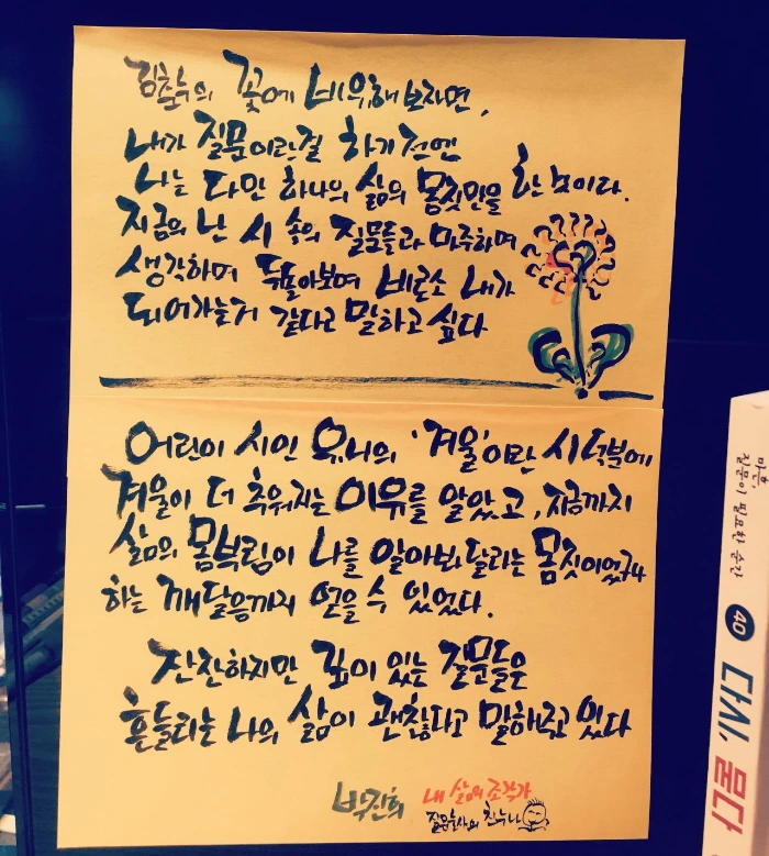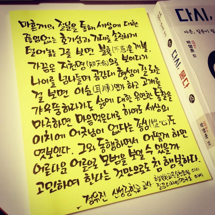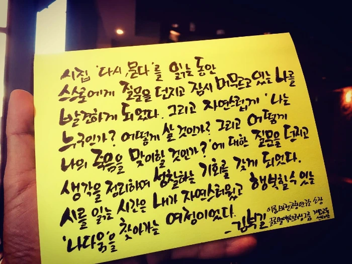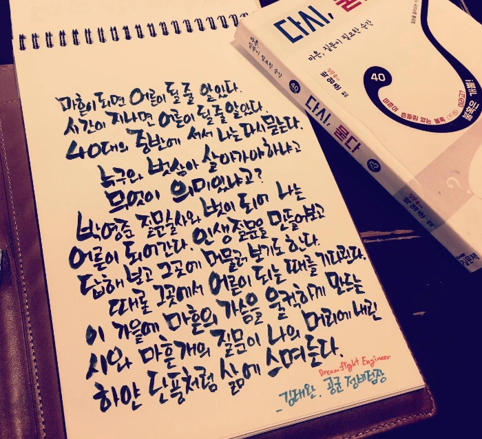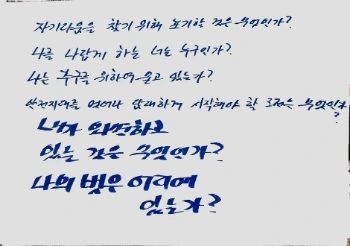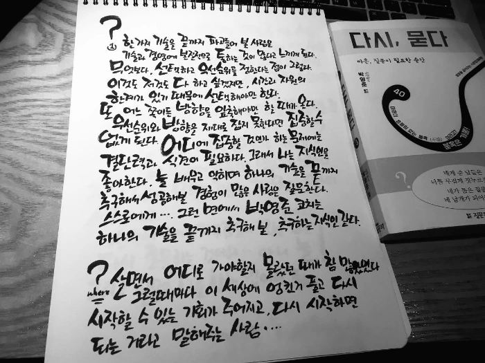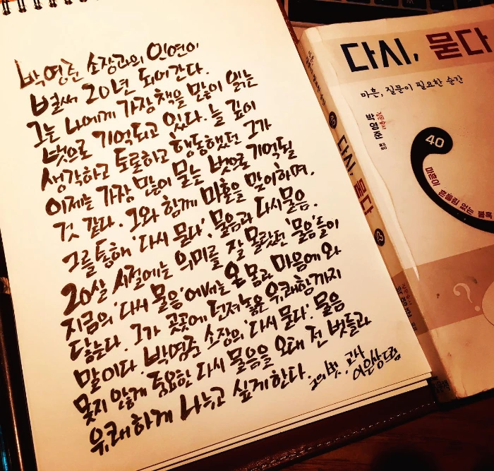 그의 나이가 나와 비슷한 연배라는데 적잖이 놀라면서도 내년에 내가 닥치게 될 나이에서 어떤 질문들을 던질지가 궁금했다. 손으로 한 글자, 한 글자. 내게 다가온 질문들을 적어 보았다.