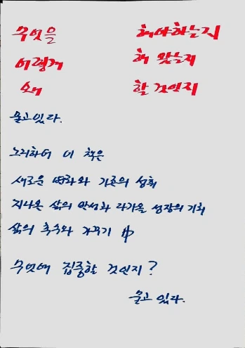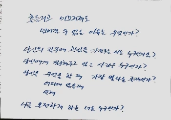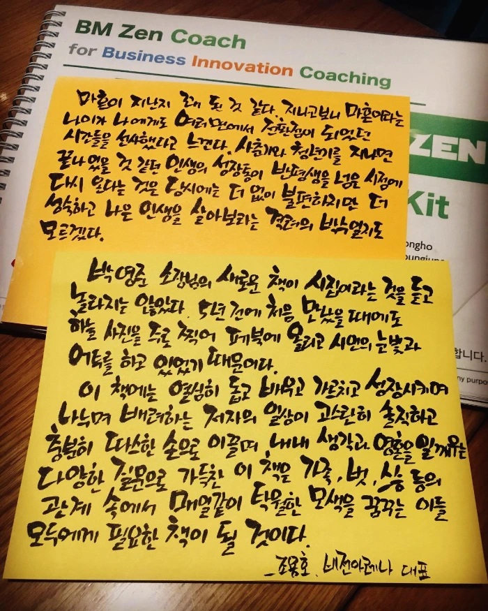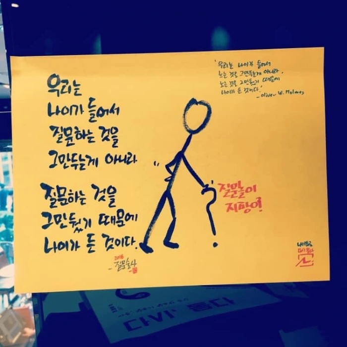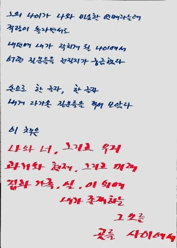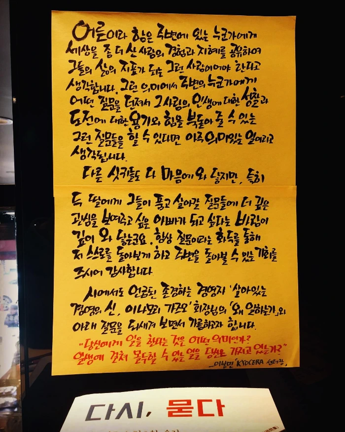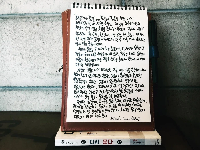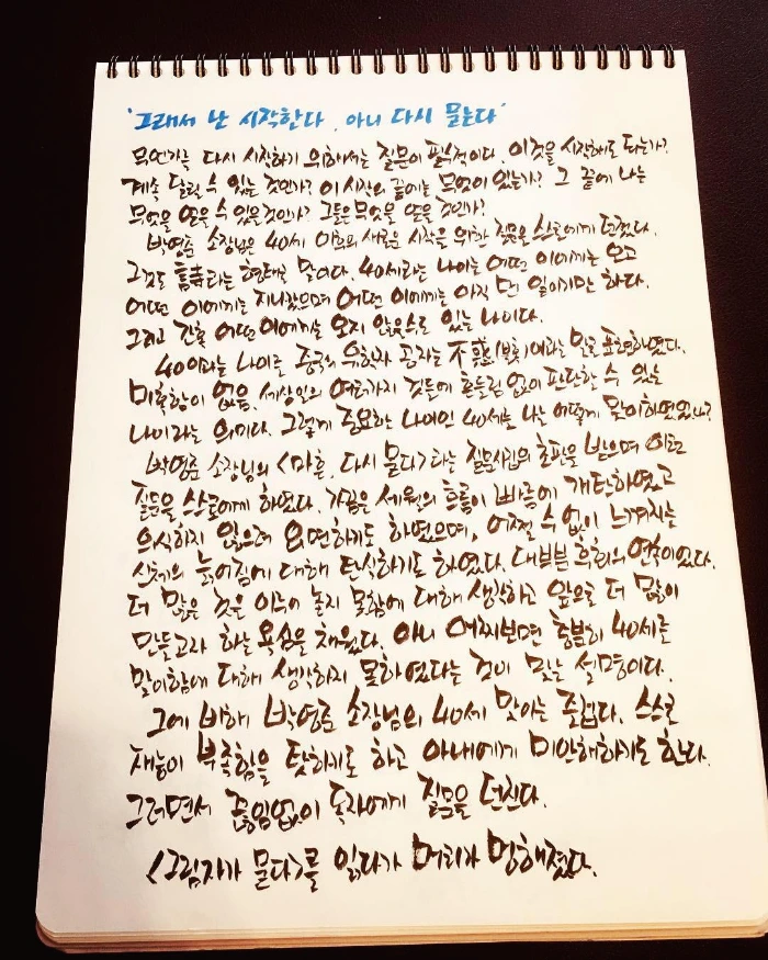 그의 나이가 나와 비슷한 연배라는데 적잖이 놀라면서도 내년에 내가 닥치게 될 나이에서 어떤 질문들을 던질지가 궁금했다. 손으로 한 글자, 한 글자. 내게 다가온 질문들을 적어 보았다.