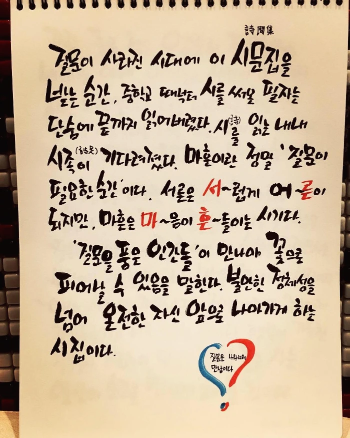 질문이 사라진 시대에 이 시문집(詩問集)을 받는 순간, 중학교 때부터 시를 써온 필자는 단숨에 끝까지 읽어버렸다. 시(詩)를 읽는 내내, 특히 시족(詩足)이 기다려졌다. 마흔이란 정말 ‘질문이 필요한 순간’이다. 서른은 서~럽게 어~른이 되지만, 마흔은 마~음이 흔~들이는 시기다. ‘질문을 품은 인간들’이 만나야 꽃으로 피어날 수 있음을 말한다. 불안한 정체성을 넘어 온전한 자신 앞으로 나아가게 하는 시집이다.